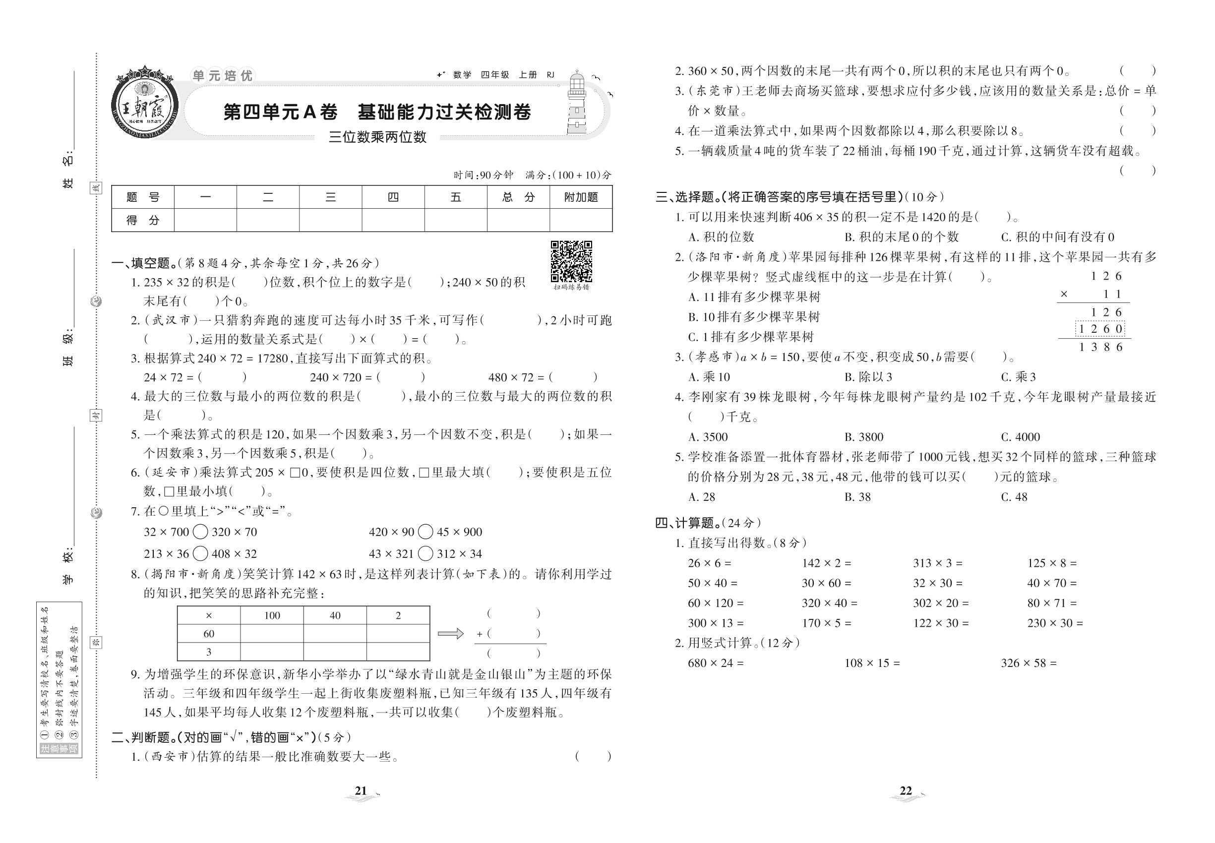 2021上册四年级数学人教版 第四单元A卷 基础能力过关检测卷