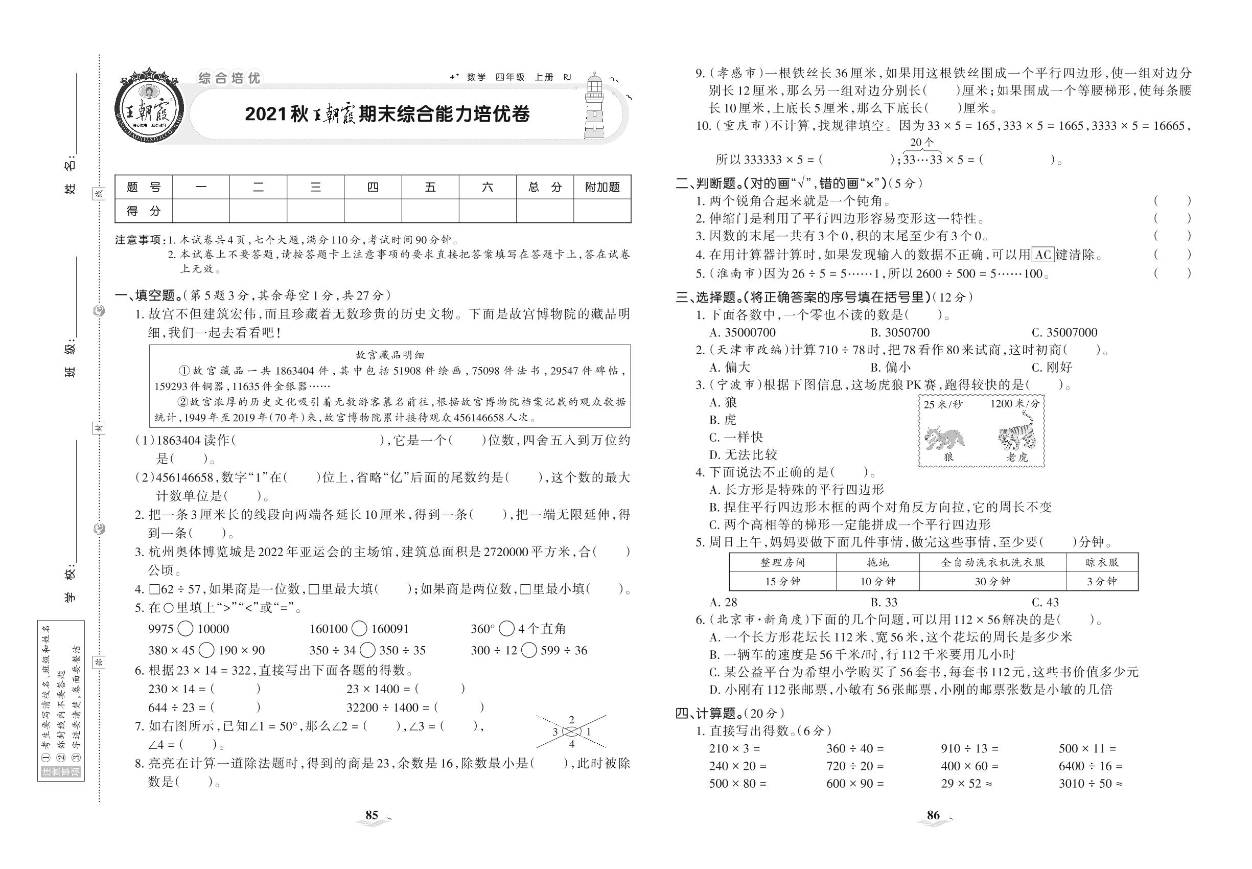 2021上册四年级数学人教版 王朝霞期末综合能力培优卷