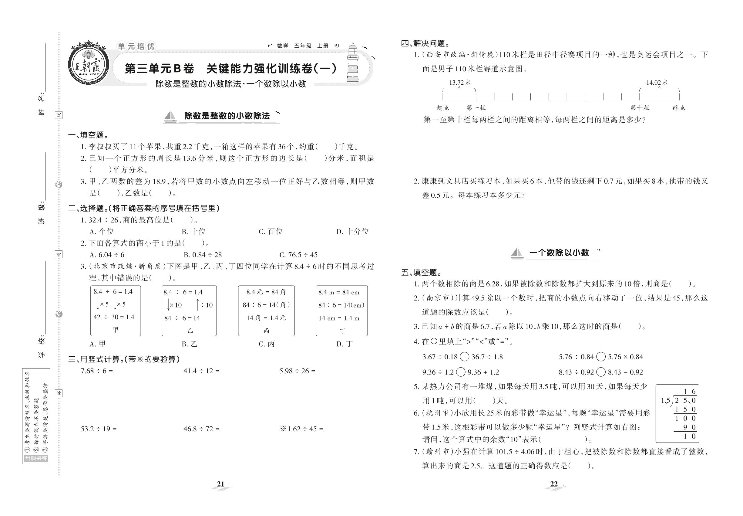 2021上册五年级数学人教版 第三单元B卷 关键能力强化训练卷(一)