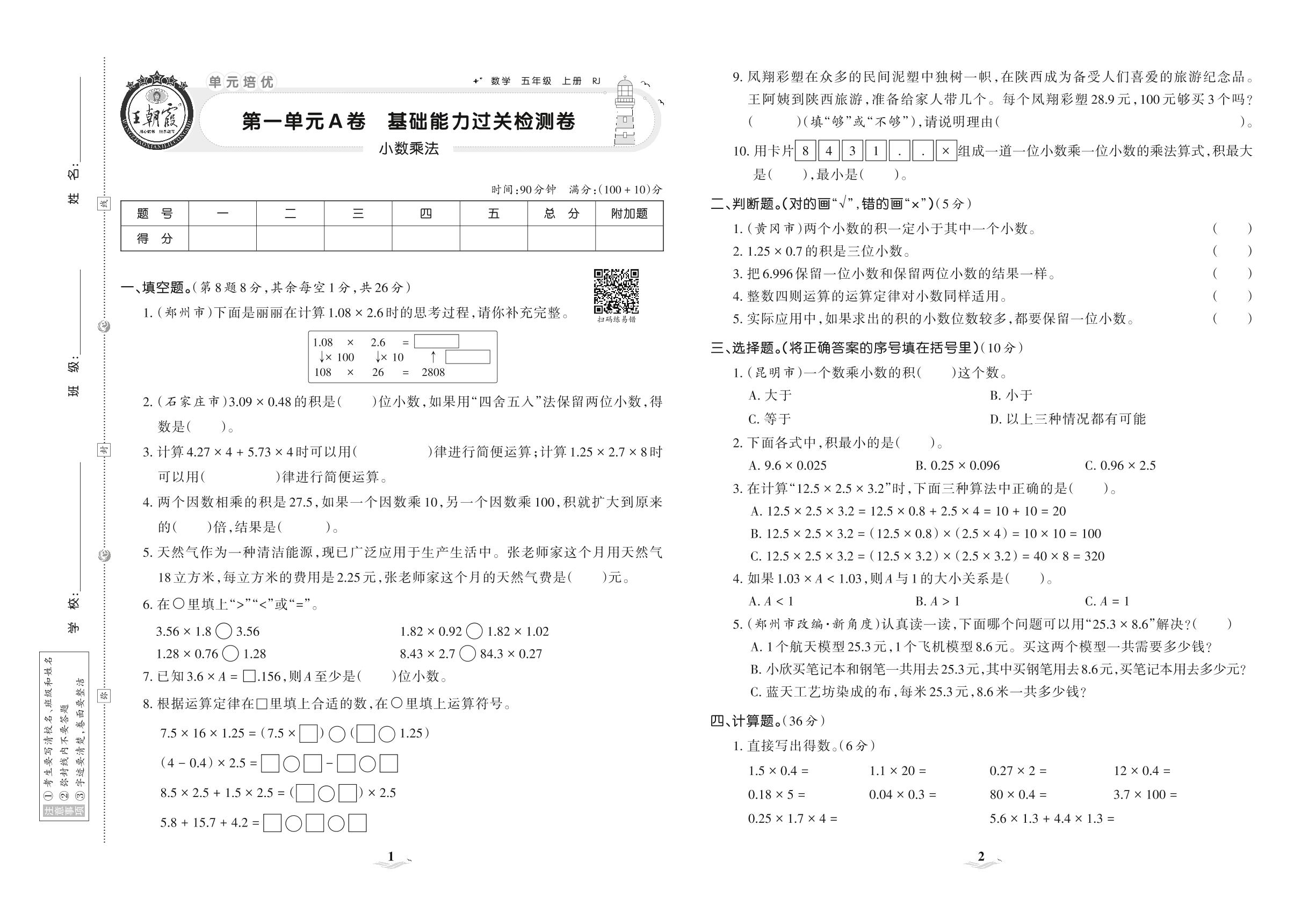2021上册五年级数学人教版 第一单元A卷 基础能力过关检测卷