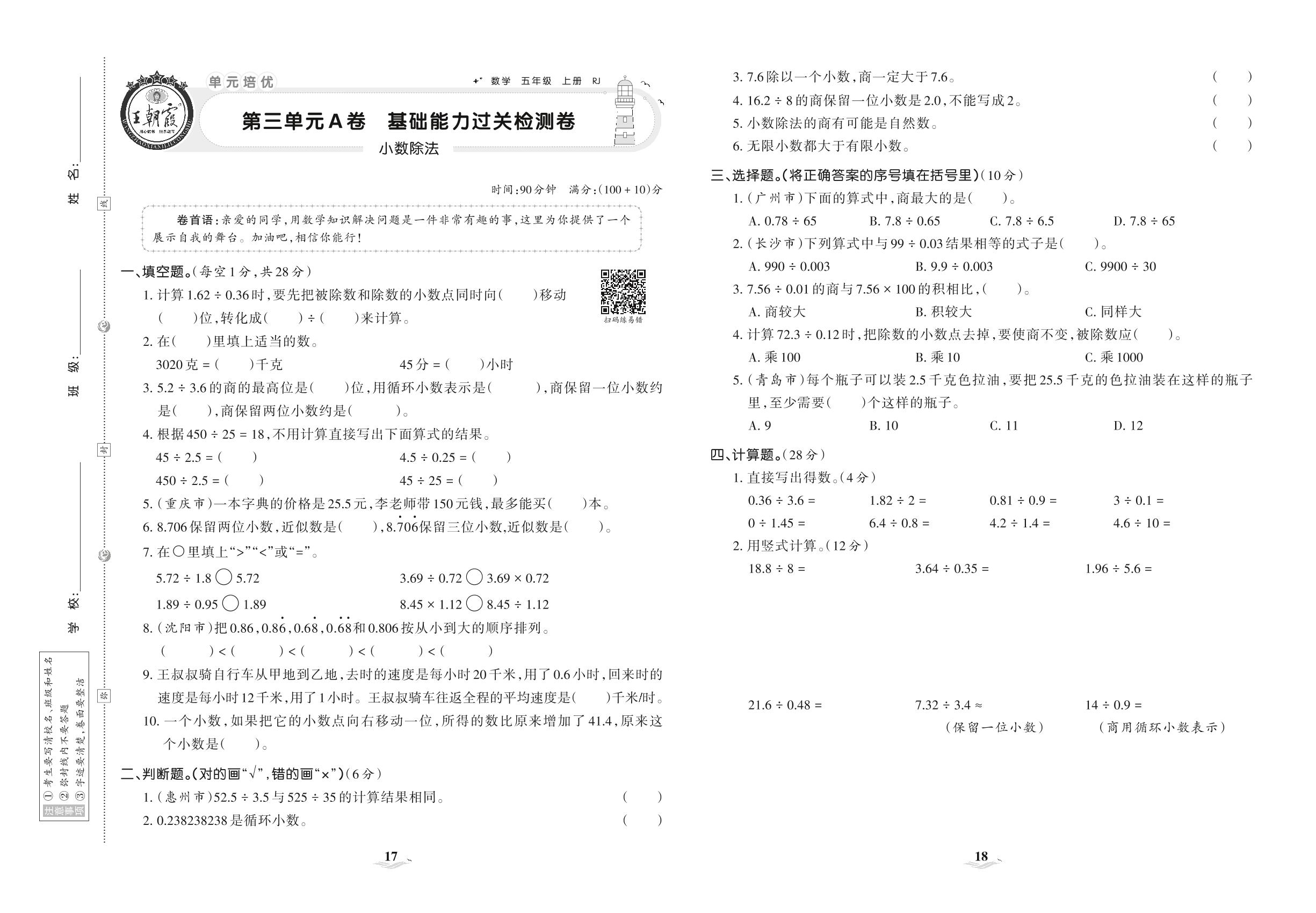 五年级数学人教版上册单元卷