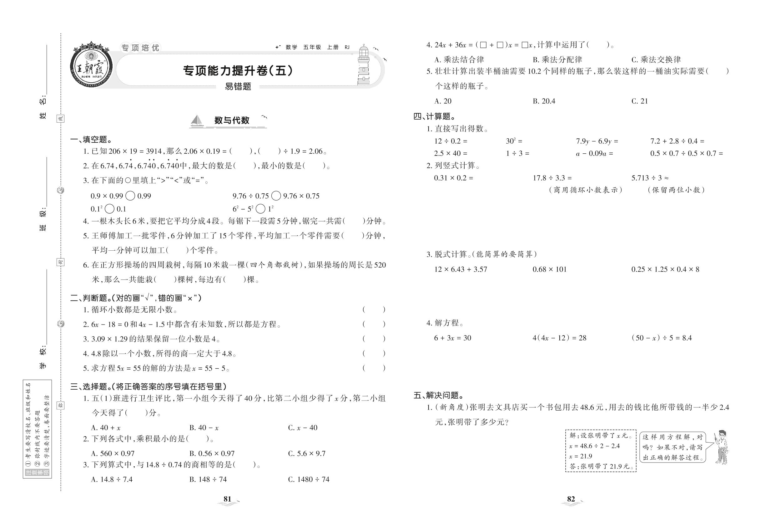 2021上册五年级数学人教版 专项能力提升卷(五) 易错题