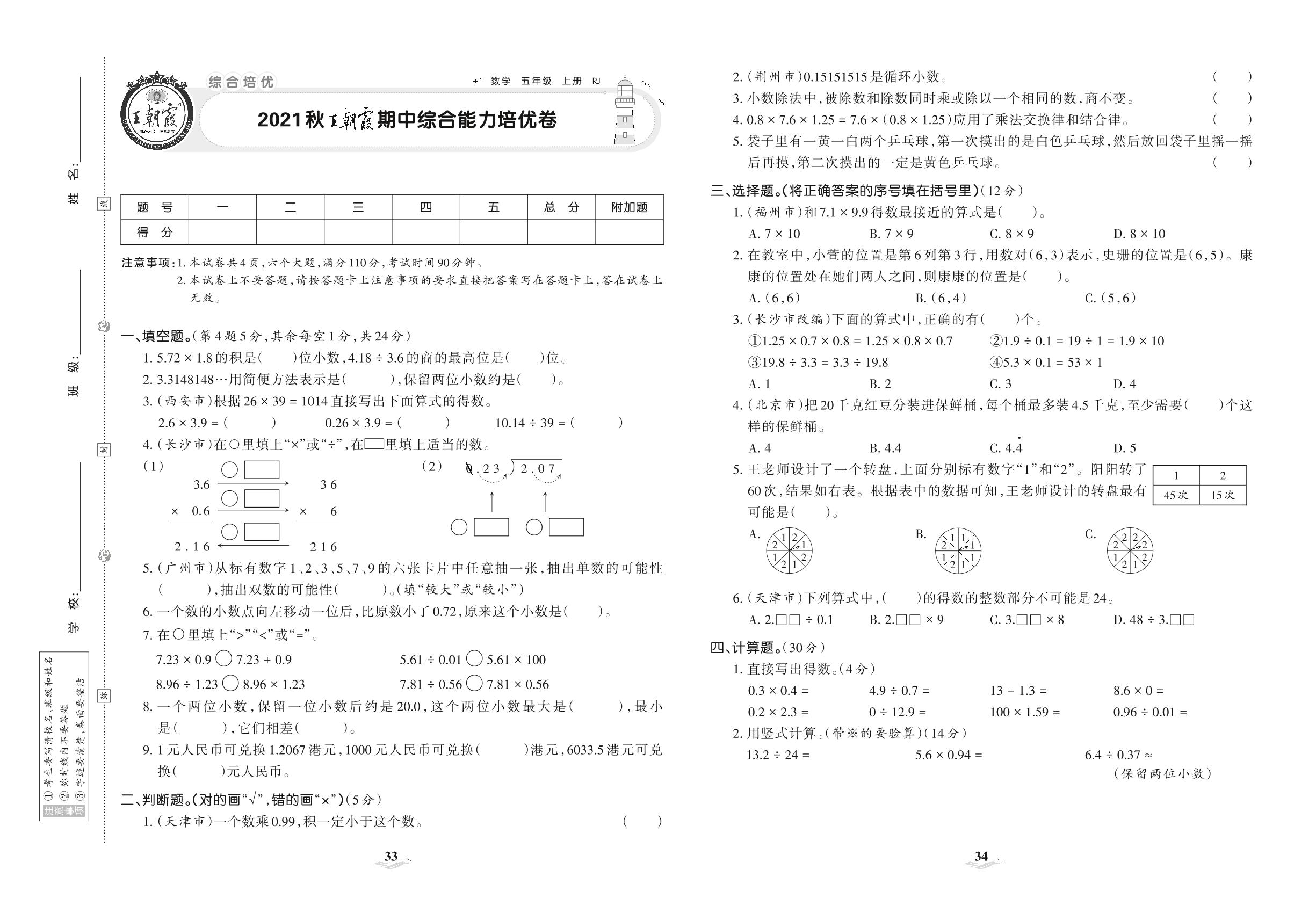 2021上册五年级数学人教版 王朝霞期中综合能力培优卷