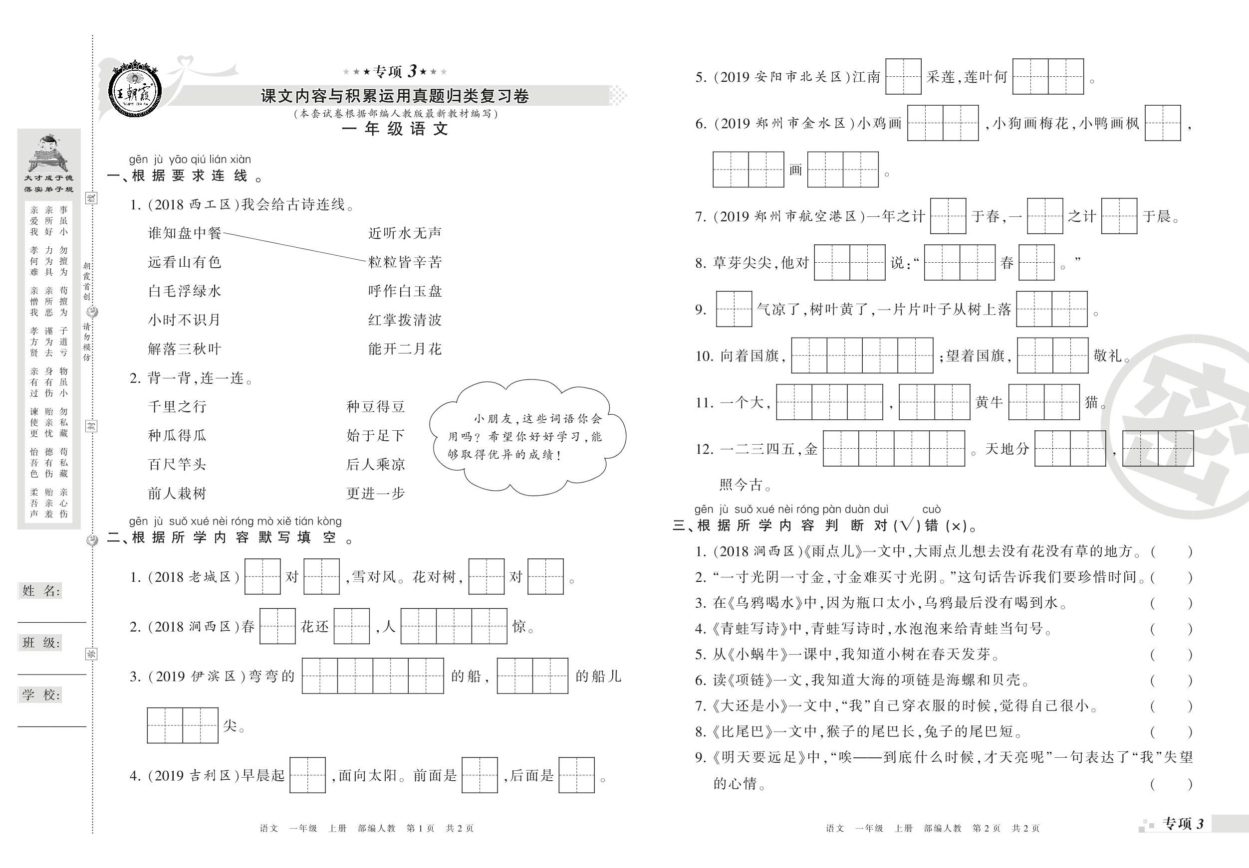 王朝霞期末专项卷——课文内容与积累运用、口语交际与写话真题归类复习卷一年级上册语文(人教版)_R210731181815【0】