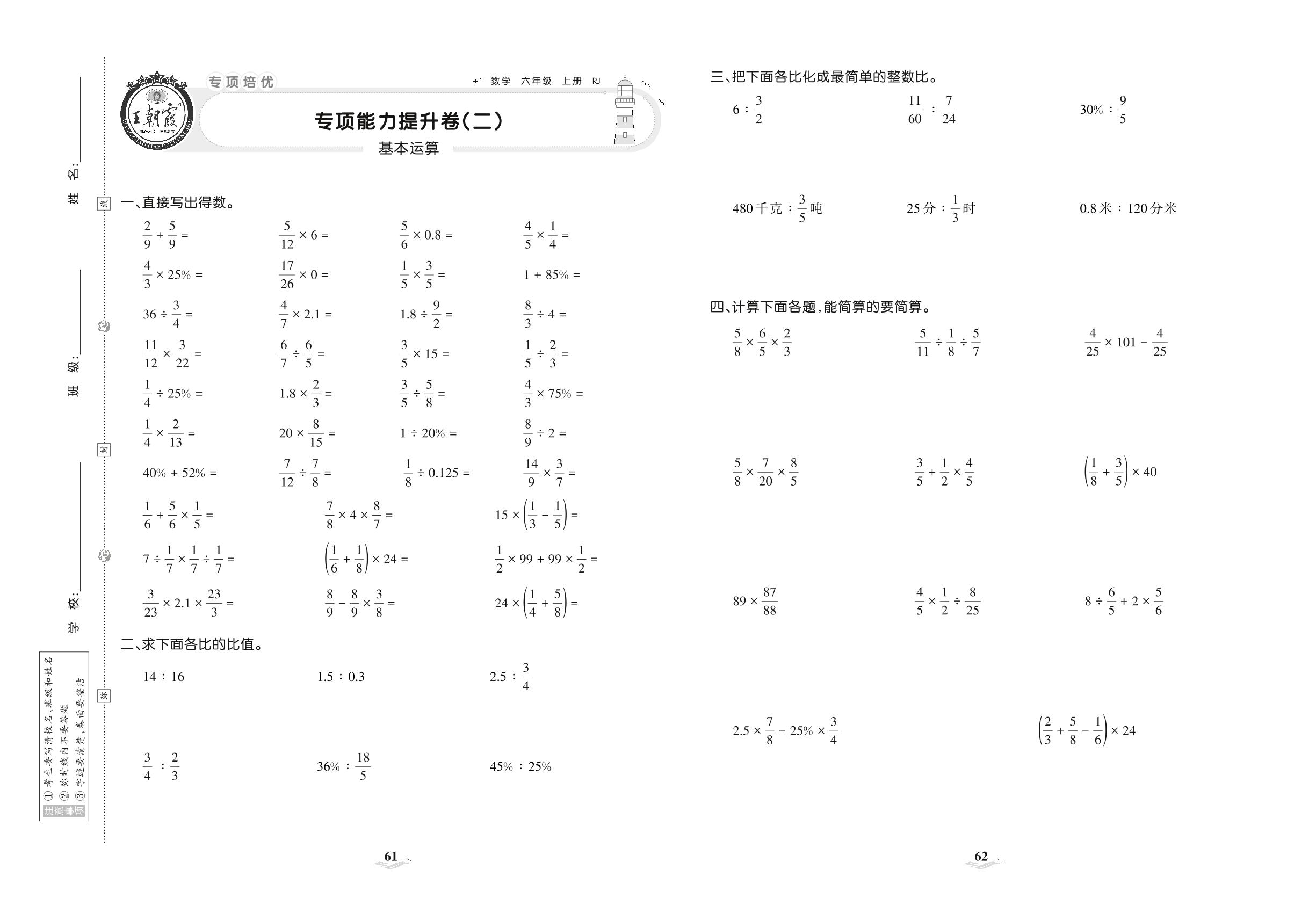 2021上册六年级数学人教版 专项能力提升卷(二) 基本运算
