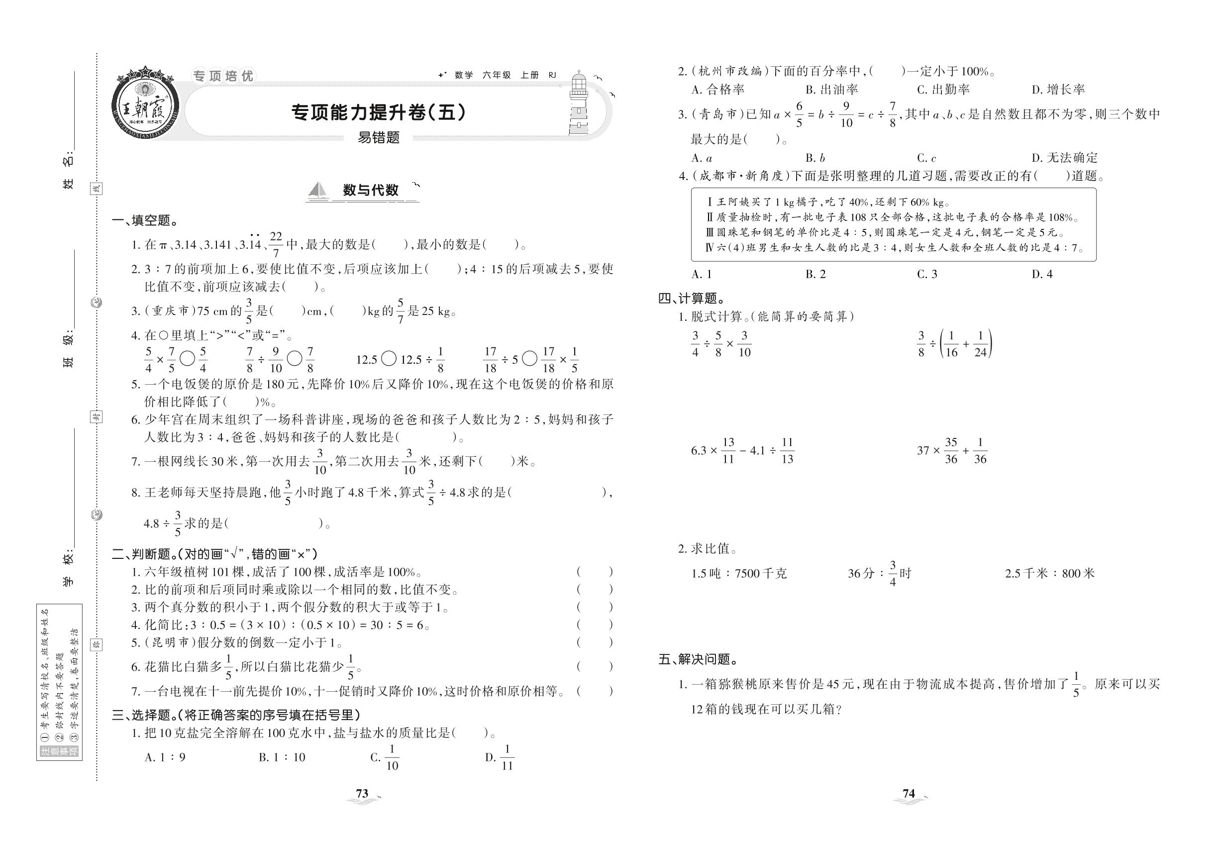 2021上册六年级数学人教版 专项能力提升卷(五) 易错题