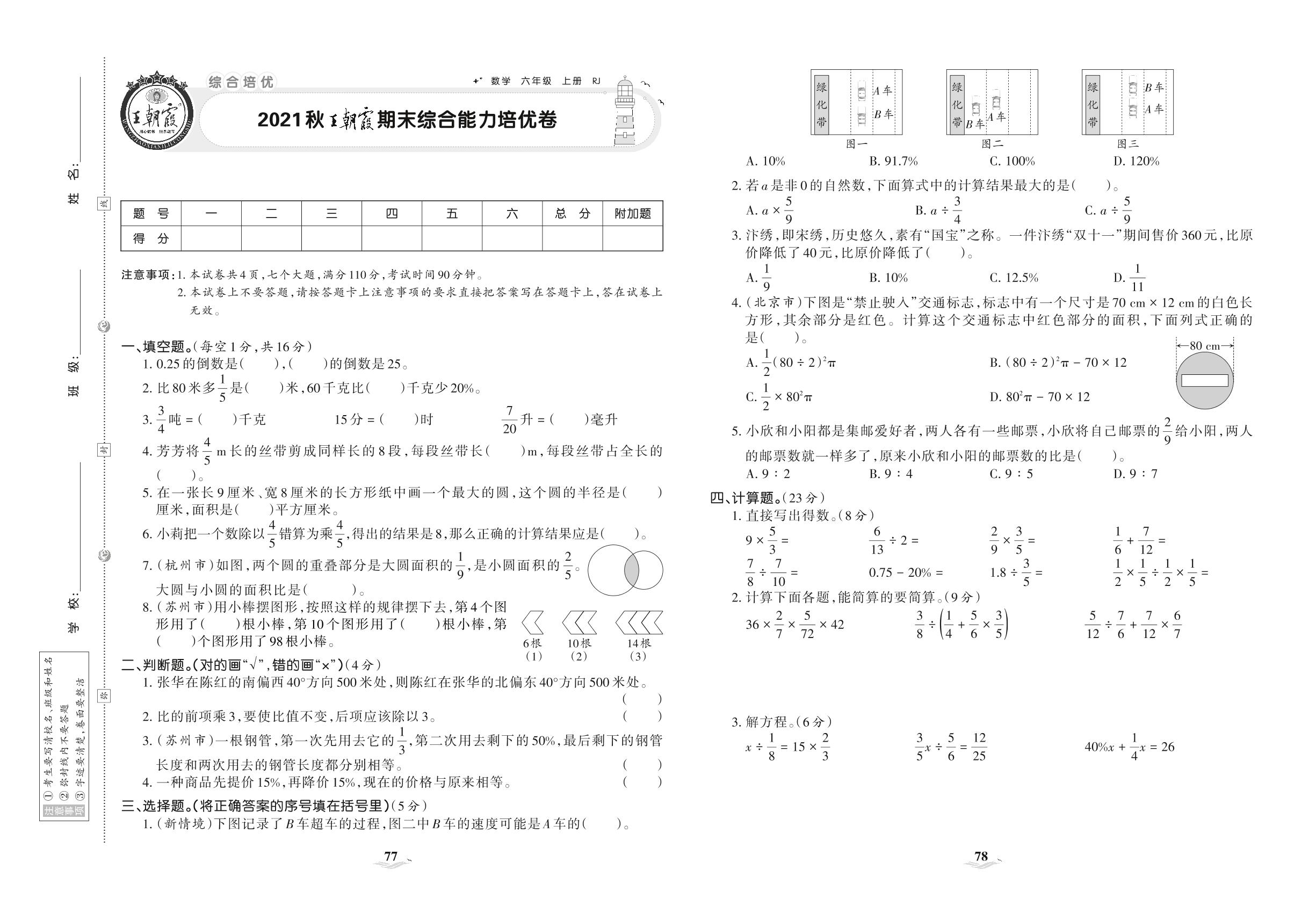 2021上册六年级数学人教版 王朝霞期末综合能力培优卷