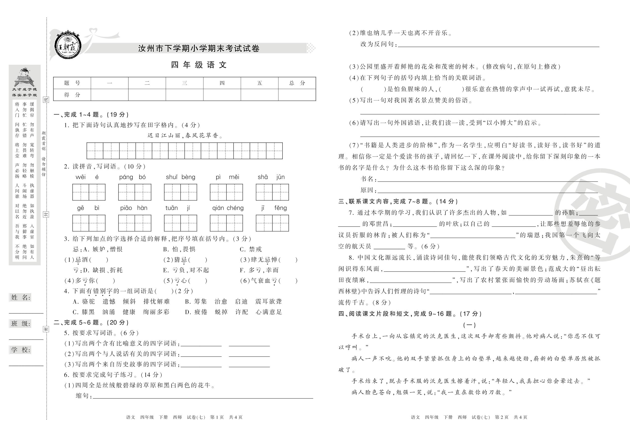 四年级语文西师版下册期末卷