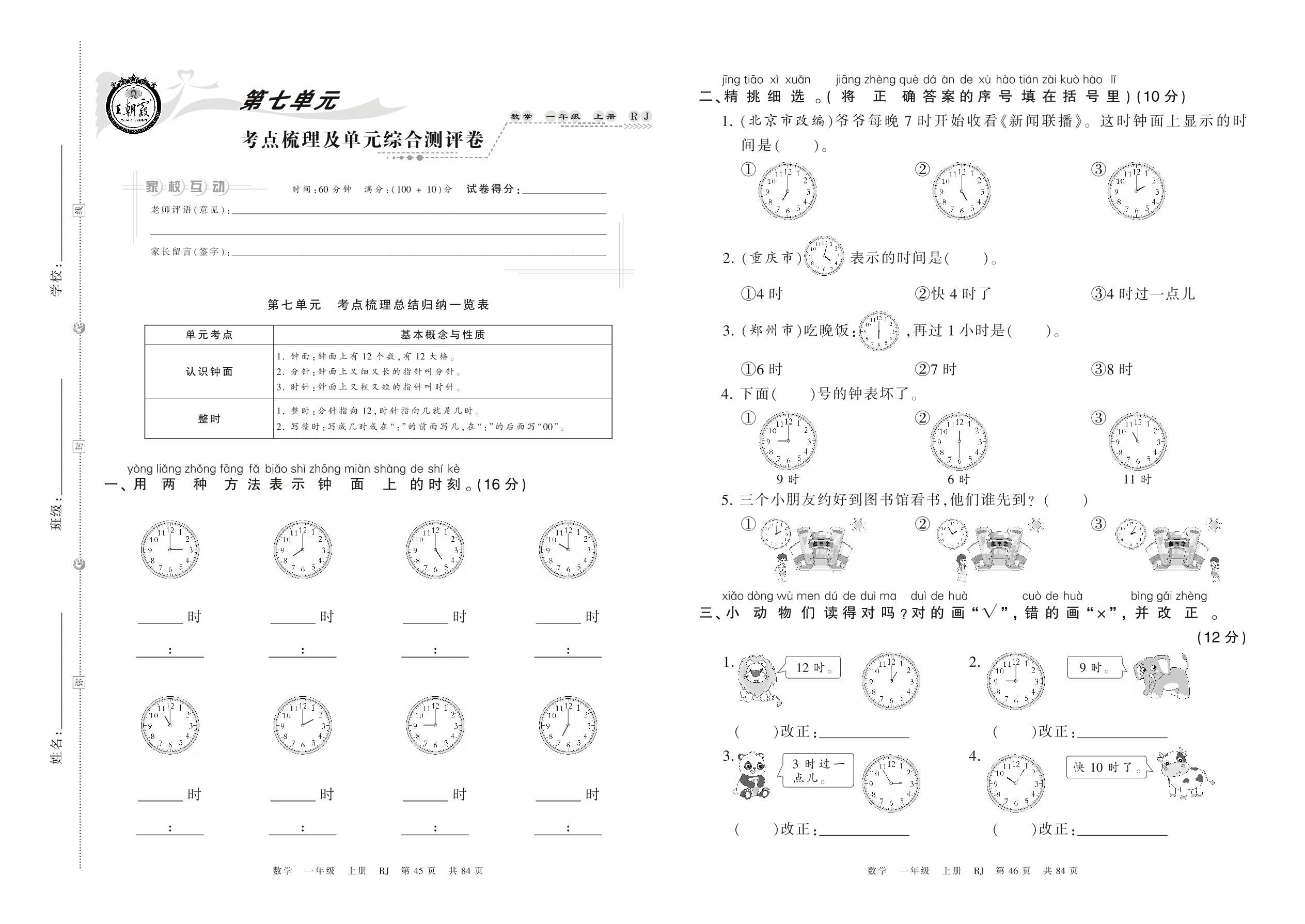 2021上册一年级数学人教版 第七单元 考点梳理及单元综合测评卷