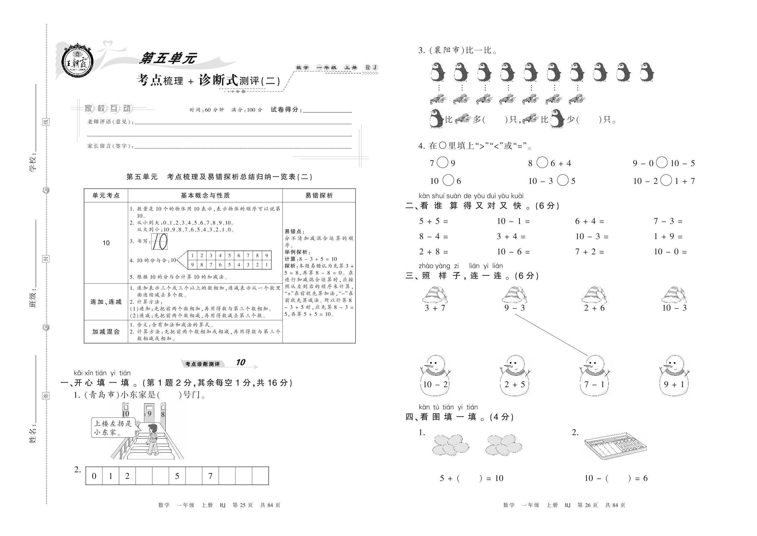 2021上册一年级数学人教版 第五单元 考点梳理 + 诊断式测评(二)
