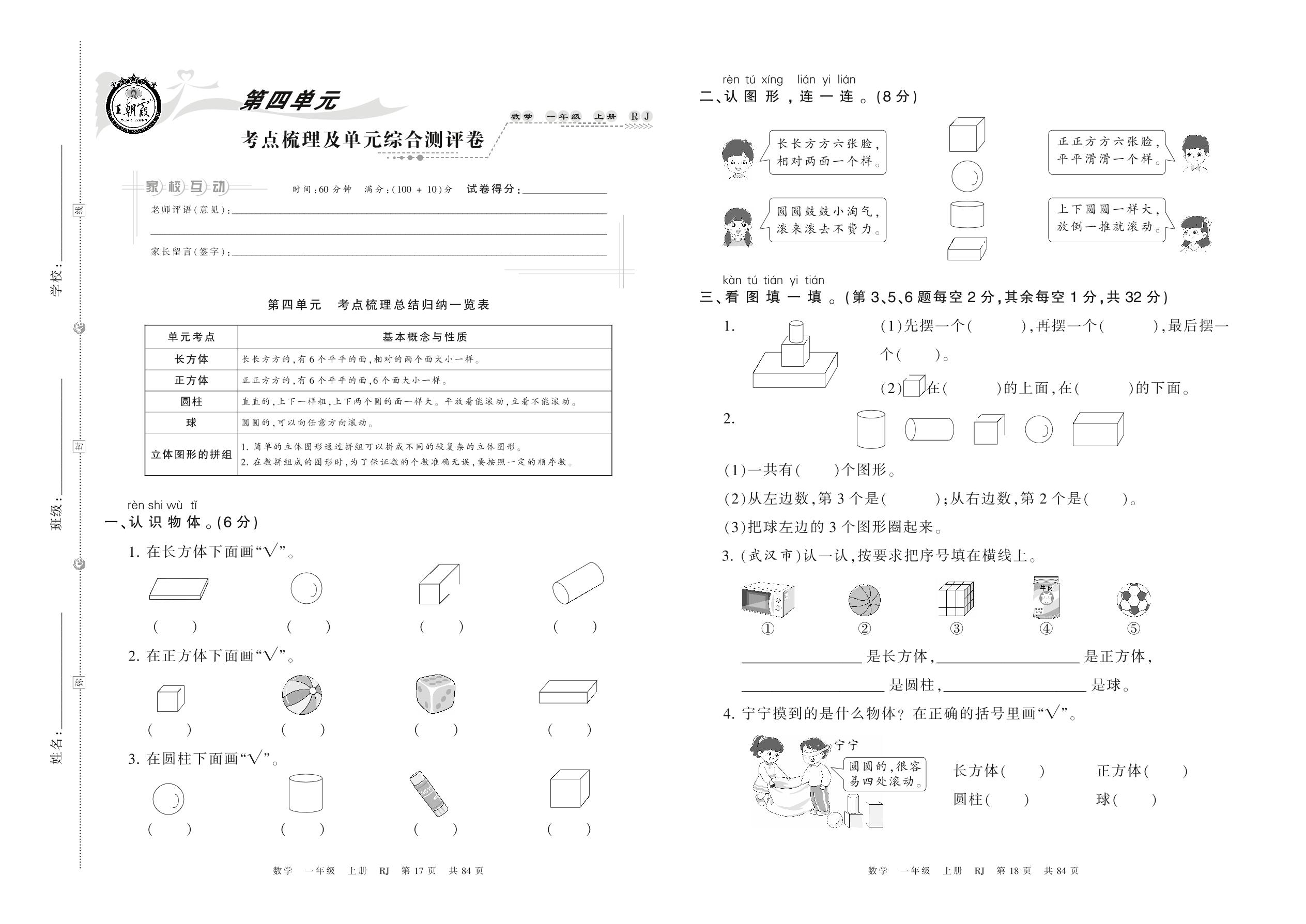 2021上册一年级数学人教版 第四单元 考点梳理及单元综合测评卷