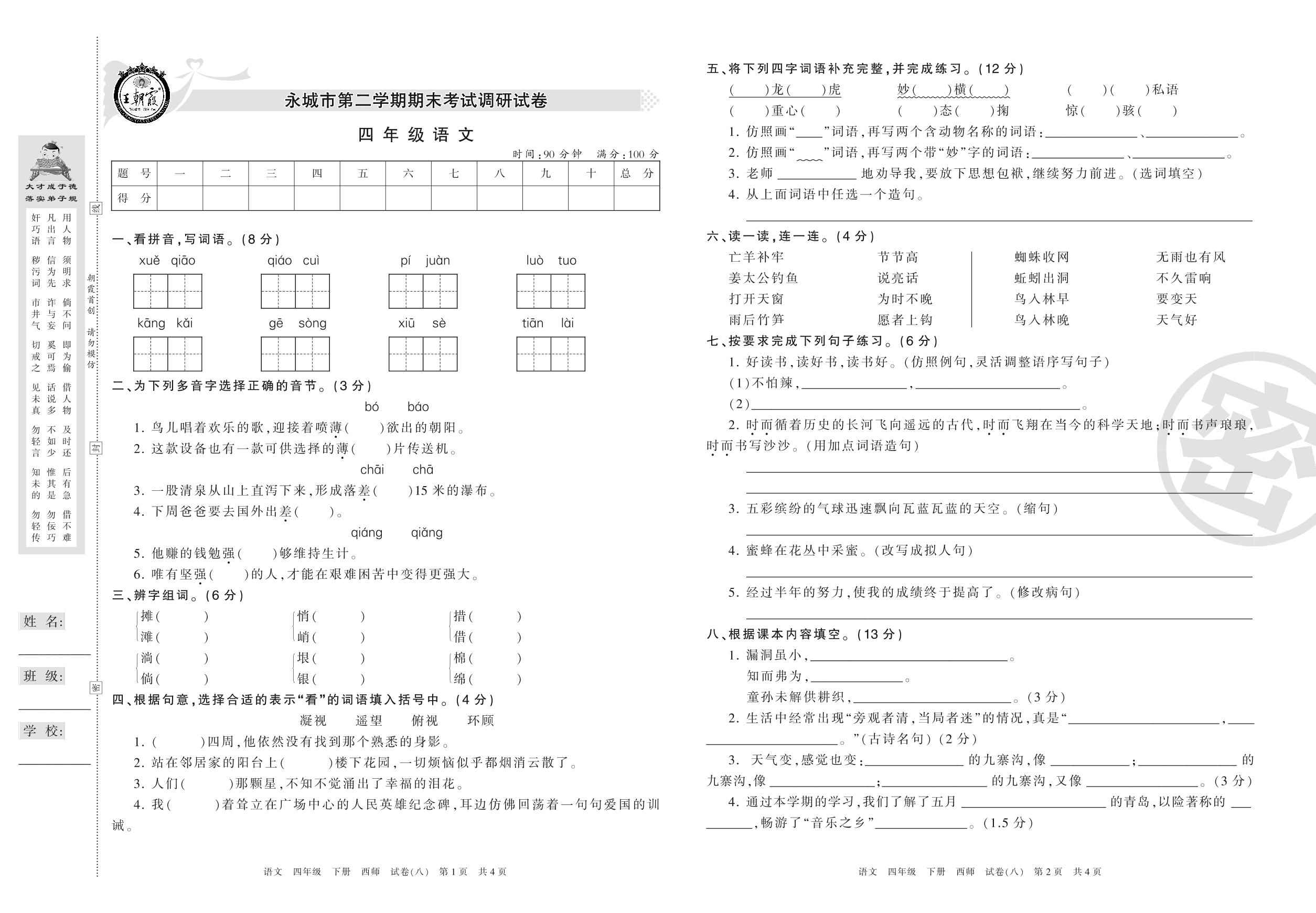 四年级语文西师版下册期末卷