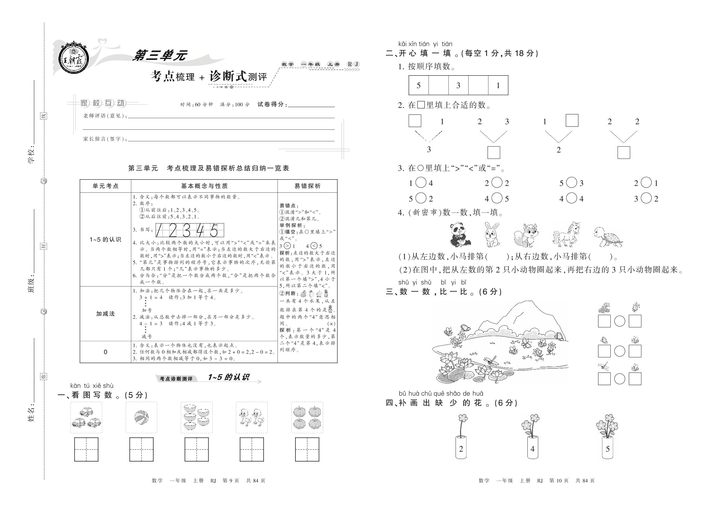 2021上册一年级数学人教版 第三单元 考点梳理 + 诊断式测评