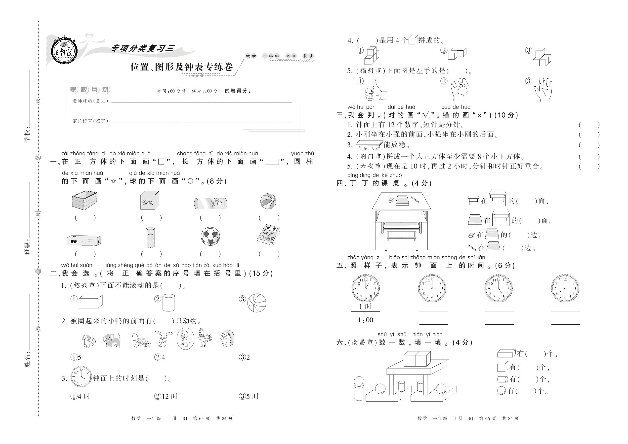 2021上册一年级数学人教版 位置、图形及钟表专练卷