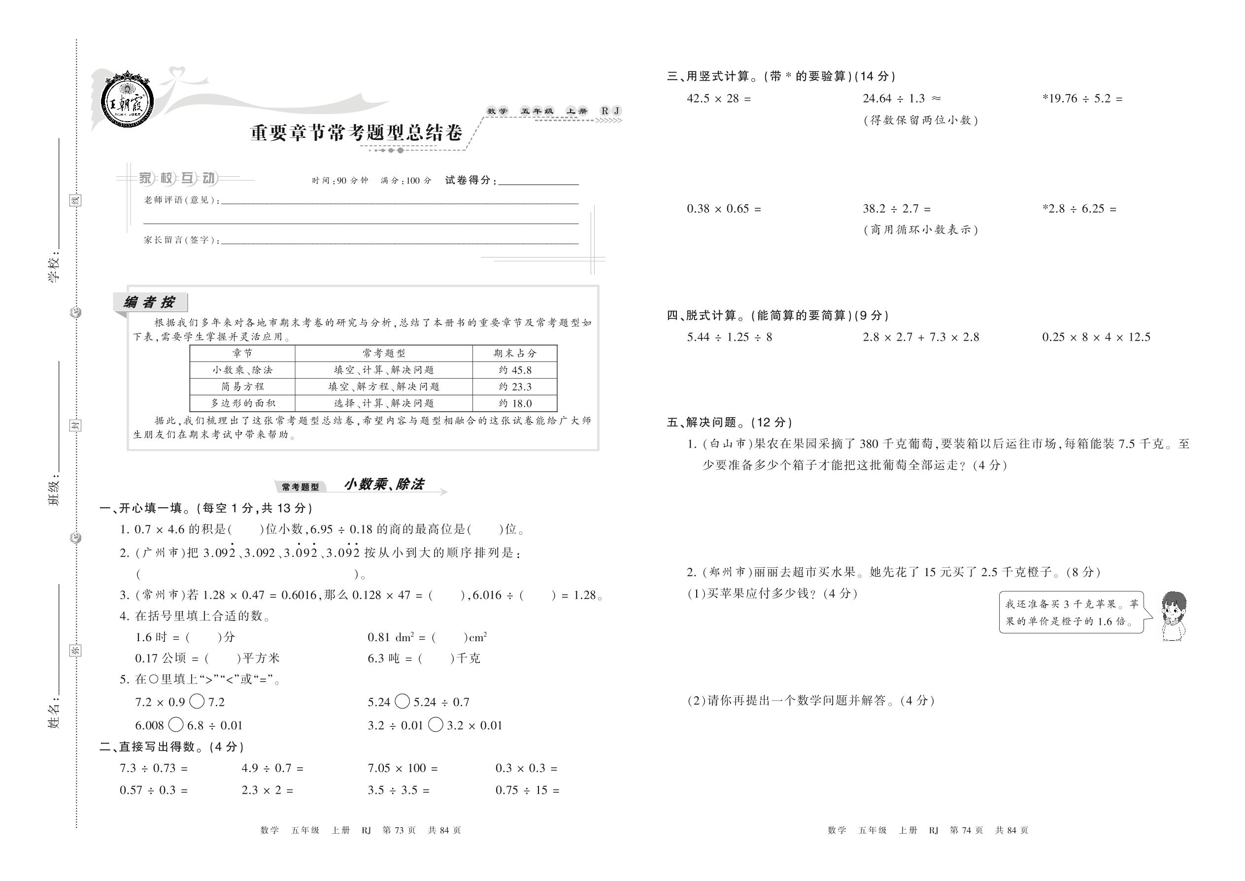2021上册五年级数学人教版 重要章节常考题型总结卷