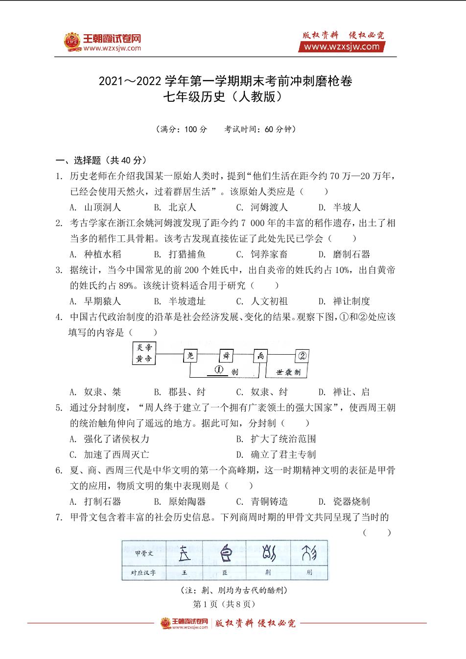 2021~2022学年第一学期期末考前冲刺磨枪卷 七年级历史(人教版)