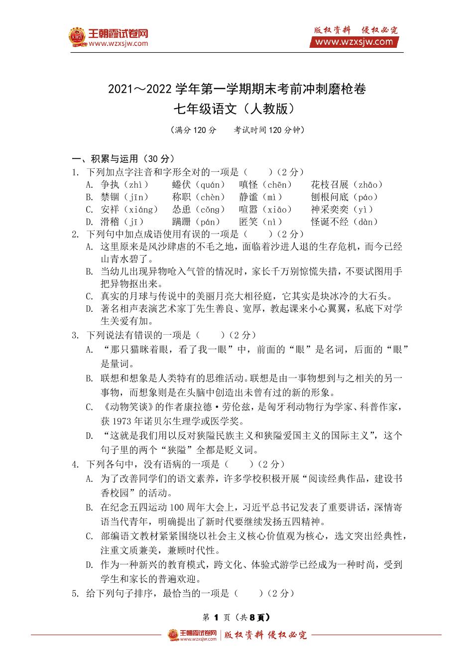 2021~2022学年第一学期期末考前冲刺磨枪卷 七年级语文(人教版)