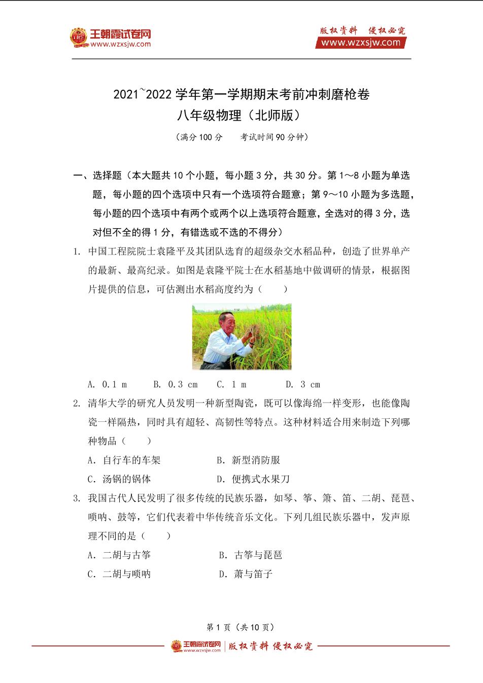 2021~2022学年第一学期期末考前冲刺磨枪卷 八年级物理(北师版)