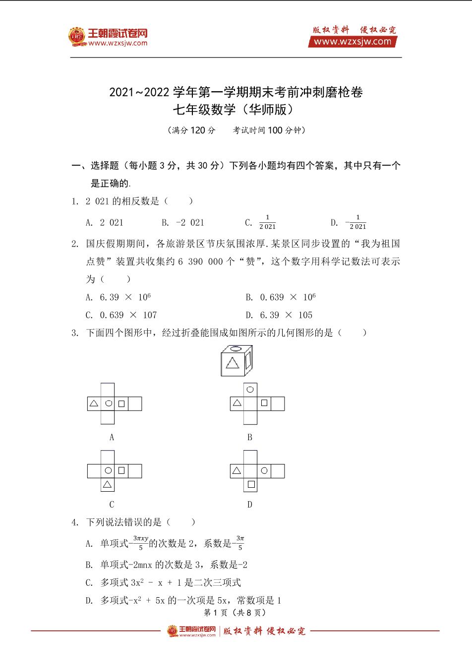 2021~2022学年第一学期期末考前冲刺磨枪卷 七年级数学(华师版)