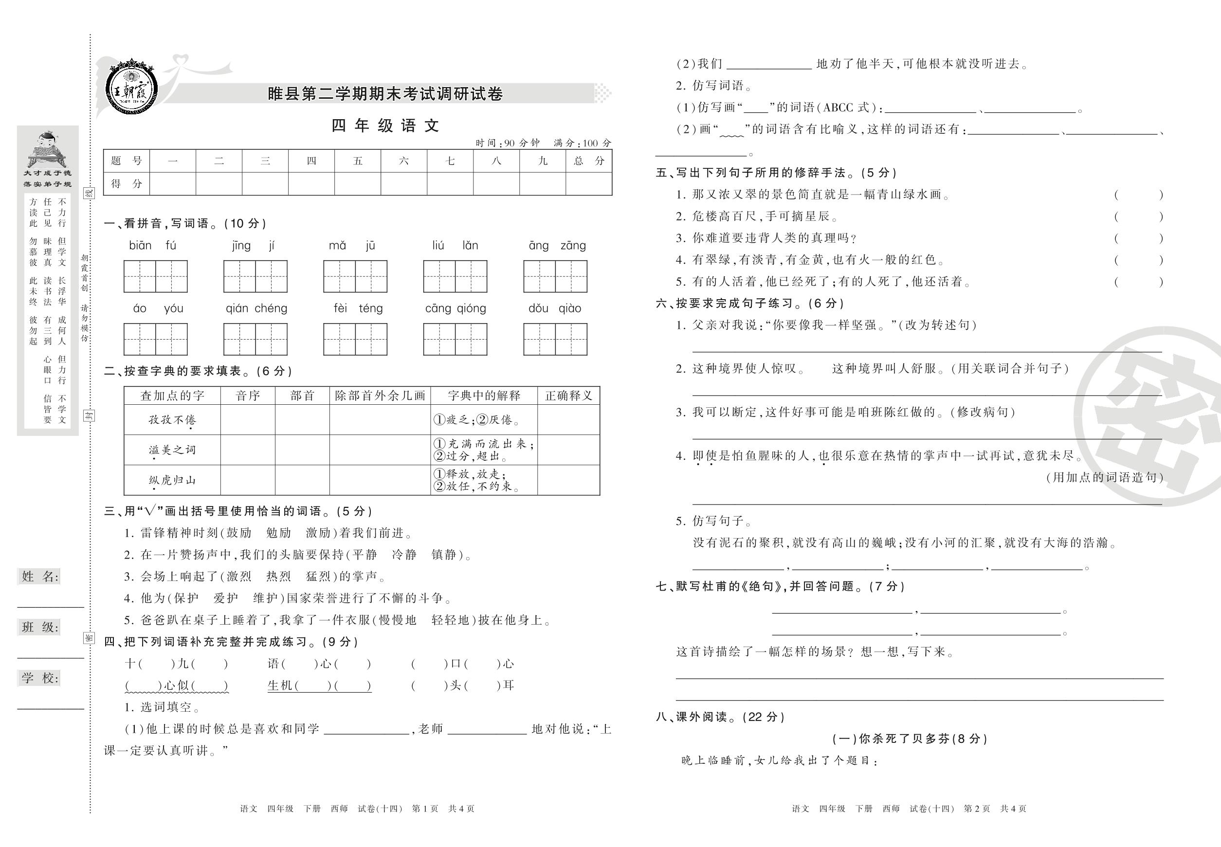 2015-2016学年第二学期商丘市睢县四年级语文试卷(西师版)【14】