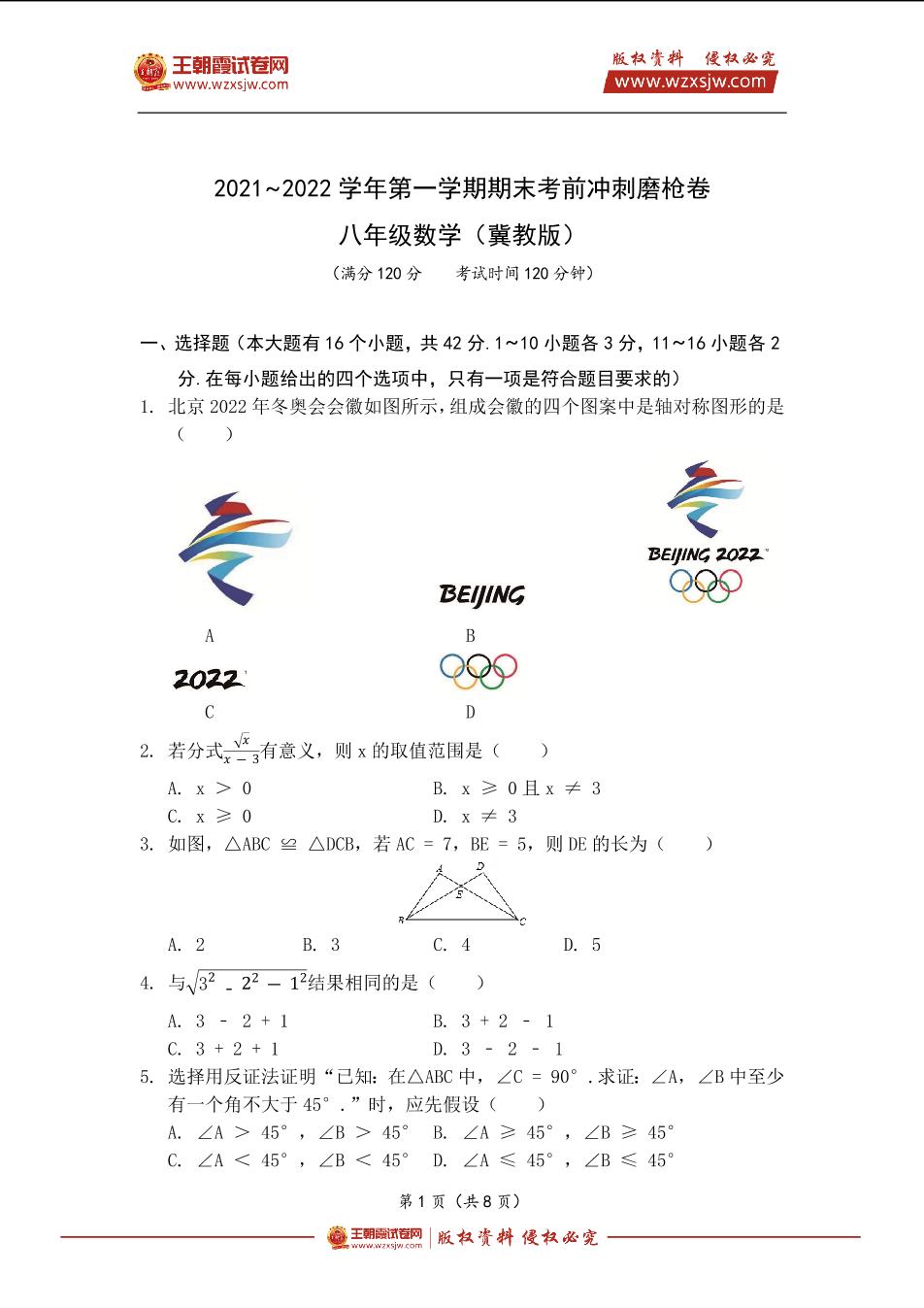2021~2022学年第一学期期末考前冲刺磨枪卷 八年级数学(冀教版)