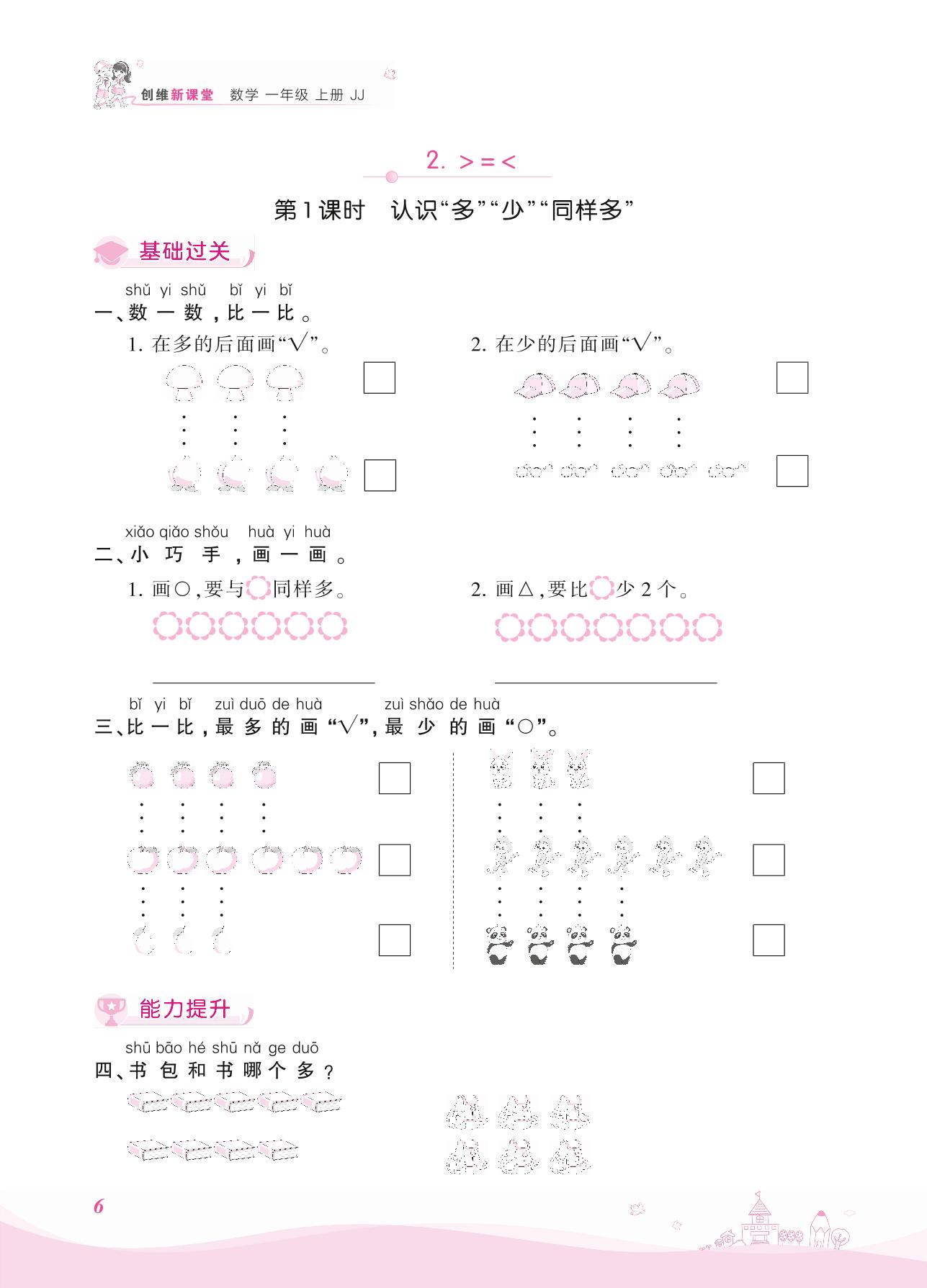 2021上册一年级数学冀教版 二 10以内数的认识 2. > = <——第1课时 认识“多”“少”“同样多”