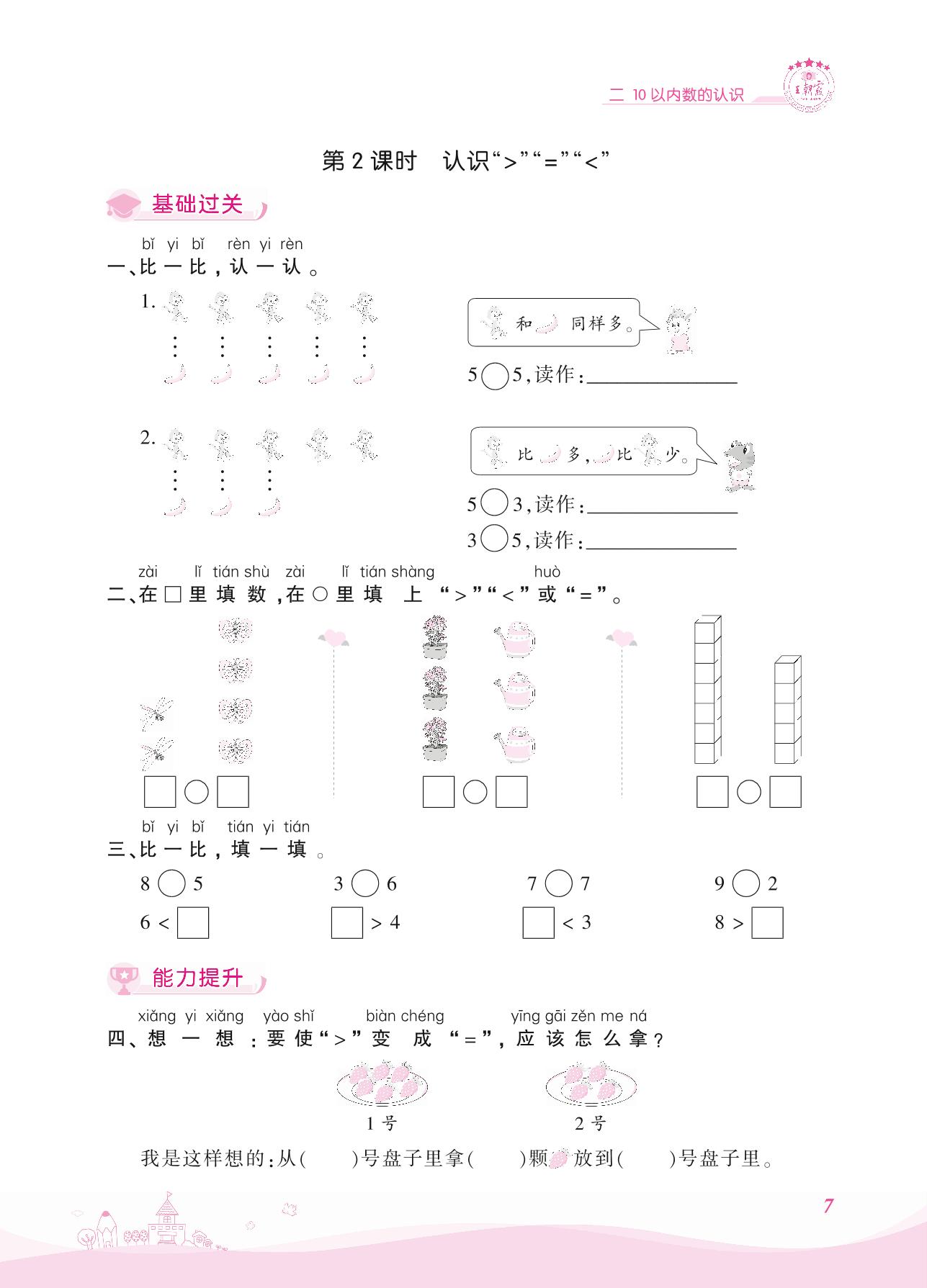 2021上册一年级数学冀教版 二 10以内数的认识 2. > = <——第2课时 认识“>”“=”“<”