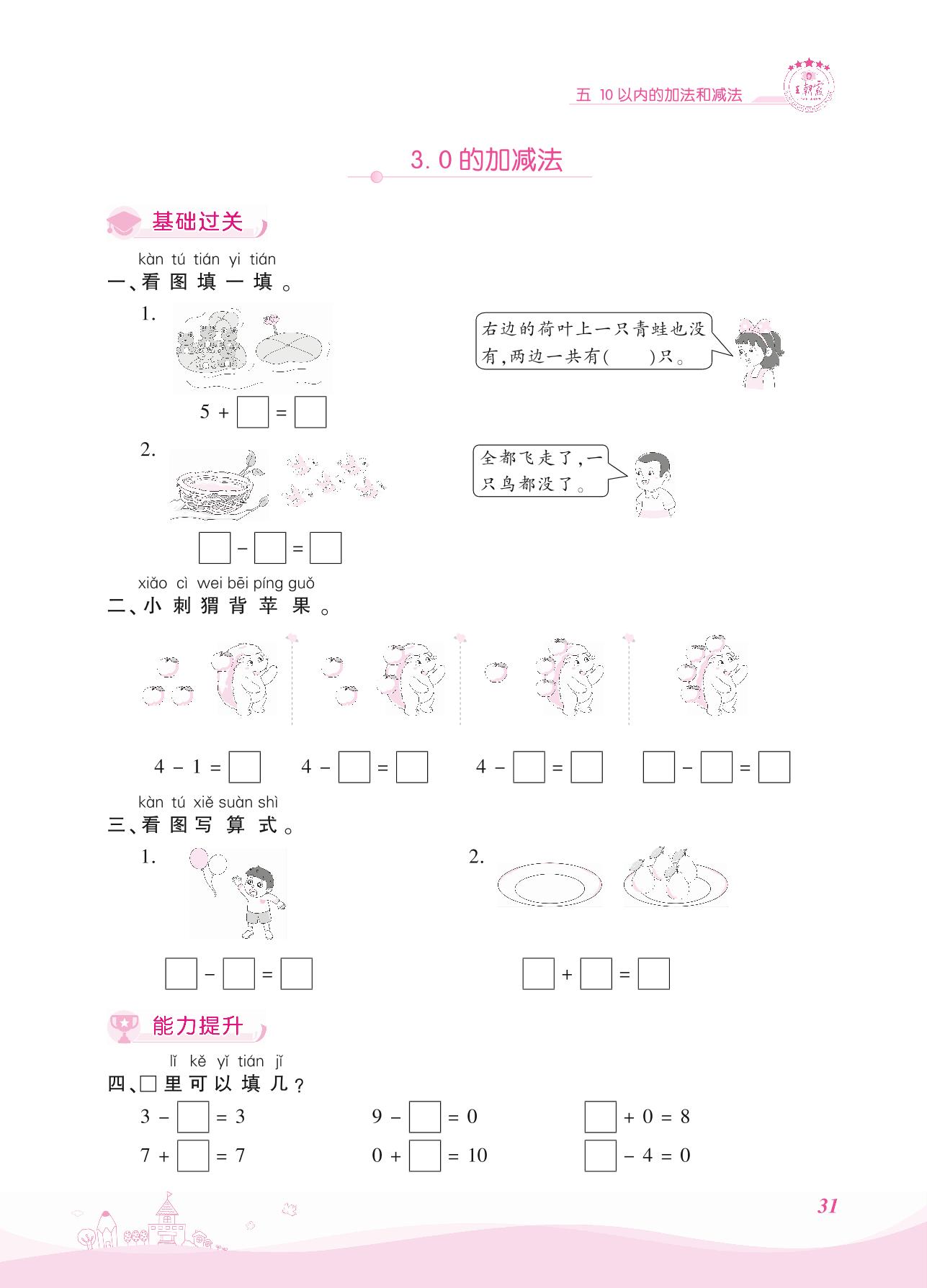 2021上册一年级数学冀教版 五 10以内的加法和减法 3. 0的加减法