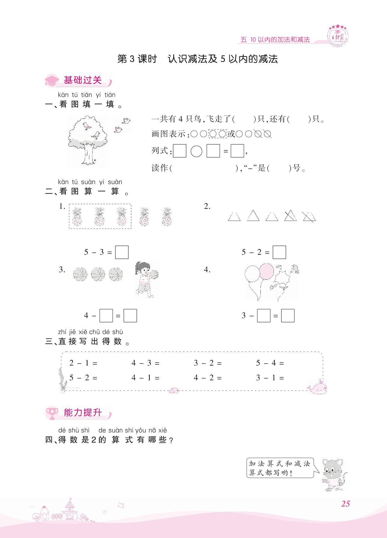 2021上册一年级数学冀教版 五 10以内的加法和减法 1. 加法和减法——第3课时 认识减法及5以内的减法