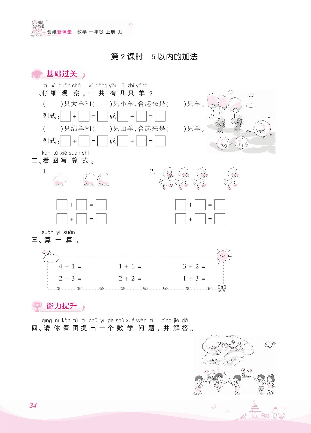 2021上册一年级数学冀教版 五 10以内的加法和减法 1. 加法和减法——第2课时 5以内的加法