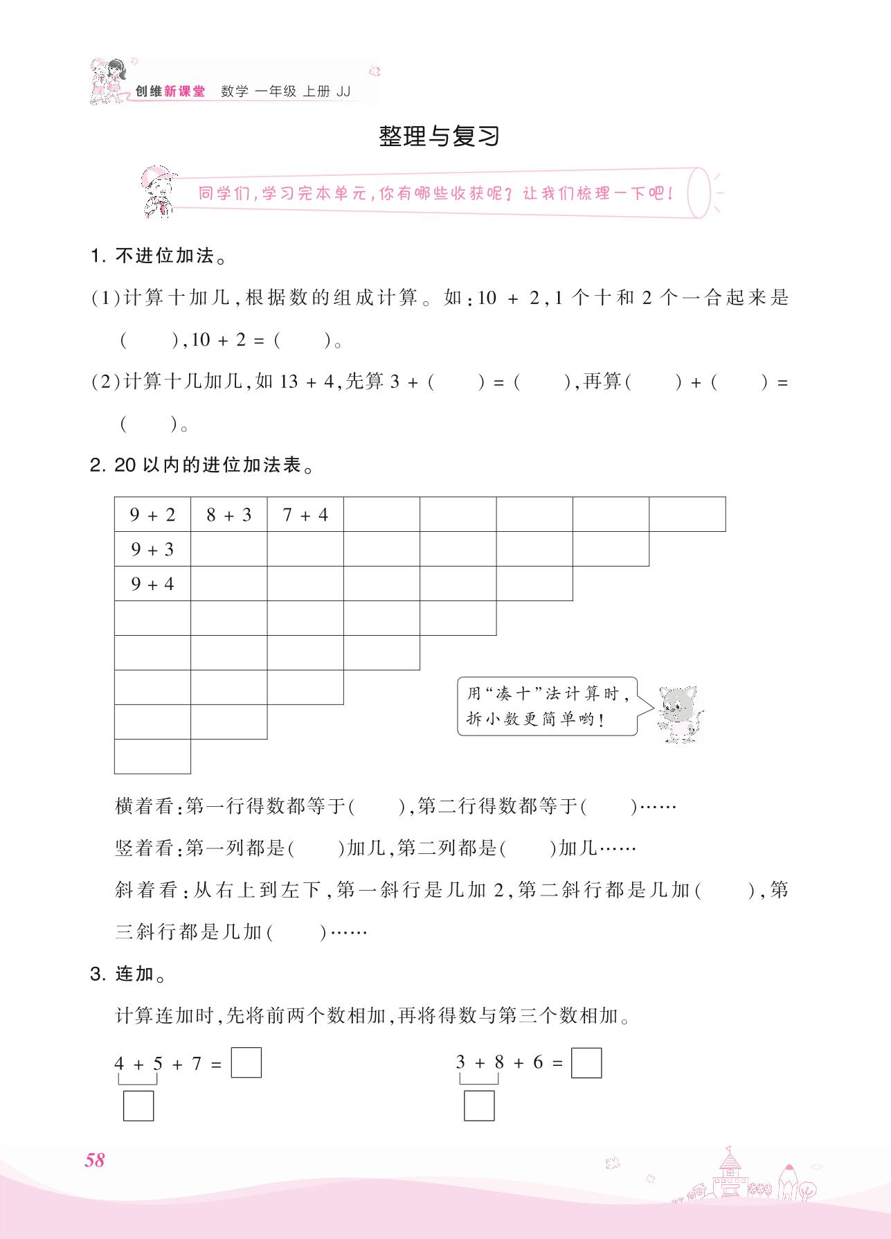 2021上册一年级数学冀教版 八 20以内的加法——整理与复习