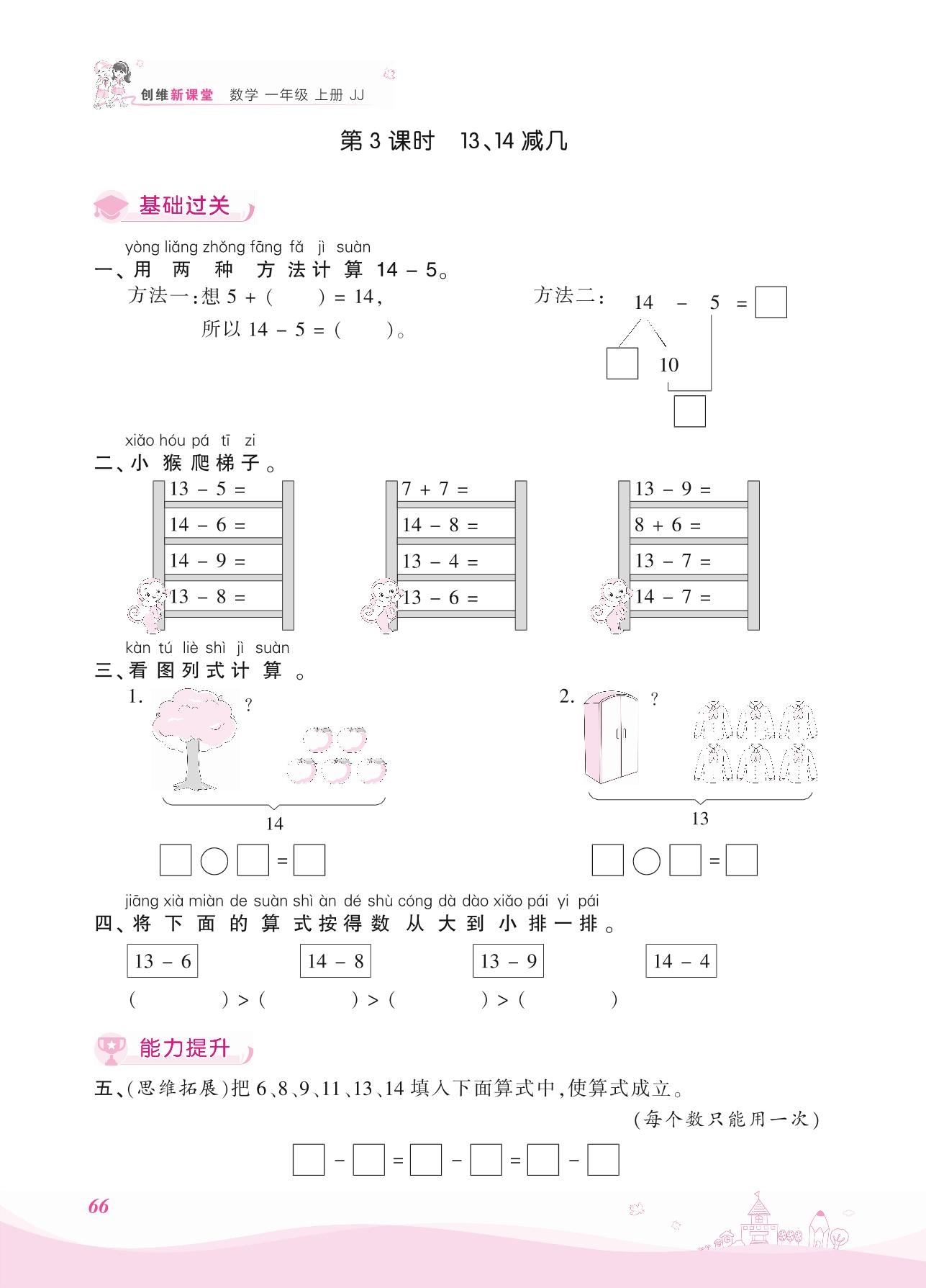 2021上册一年级数学冀教版 九 20以内的减法 2. 退位减法——第3课时 13、14减几