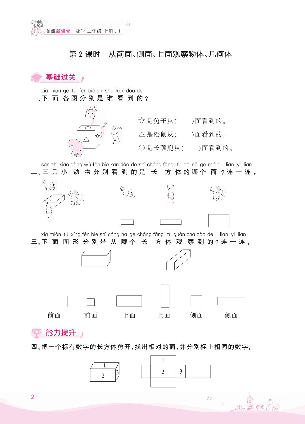 2021上册二年级数学冀教版 一 观察物体(一)——第2课时 从前面、侧面、上面观察物体、几何体