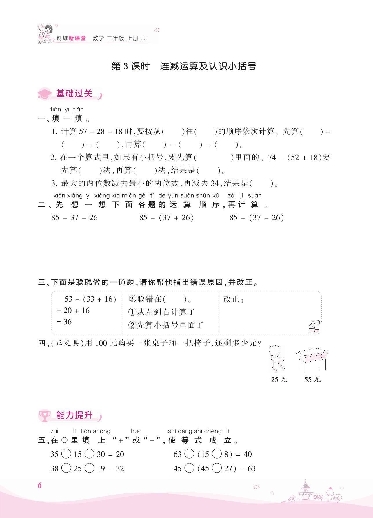 2021上册二年级数学冀教版 二 加减混合运算——第3课时 连减运算及认识小括号