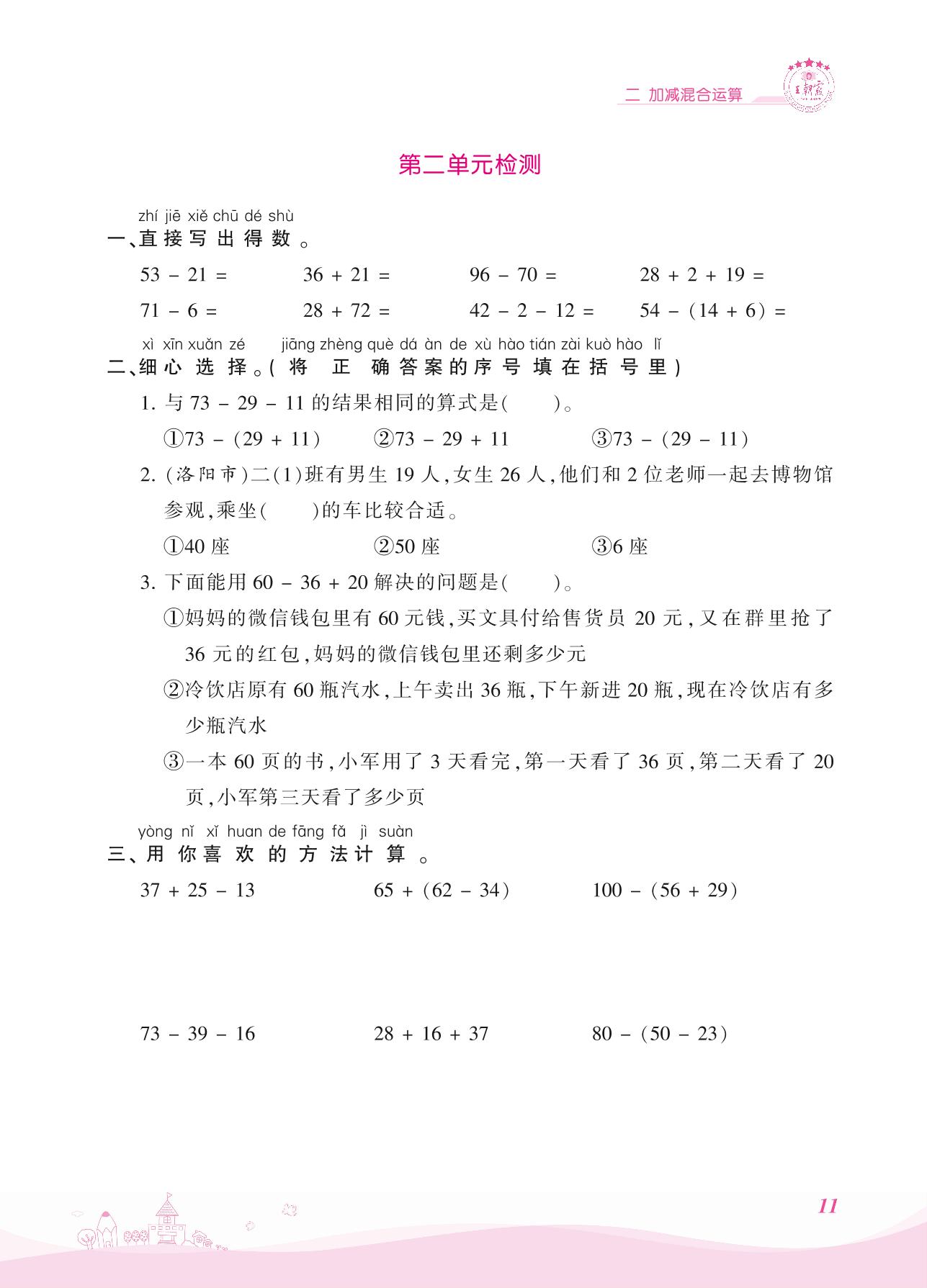 2021上册二年级数学冀教版 二 加减混合运算——第二单元检测