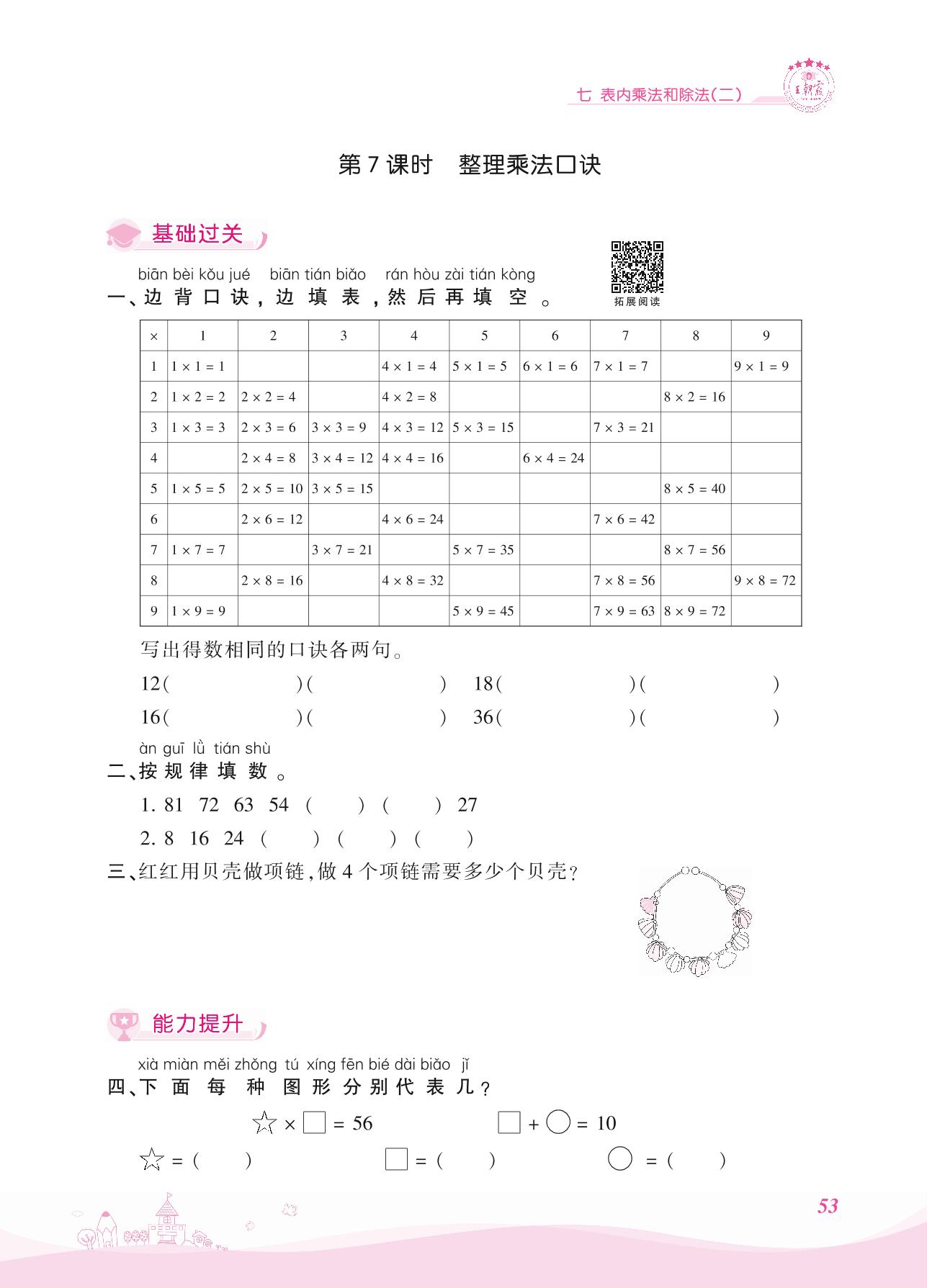 2021上册二年级数学冀教版 七 表内乘法和除法(二) 1. 7、8、9的乘法口诀——第7课时 整理乘法口诀