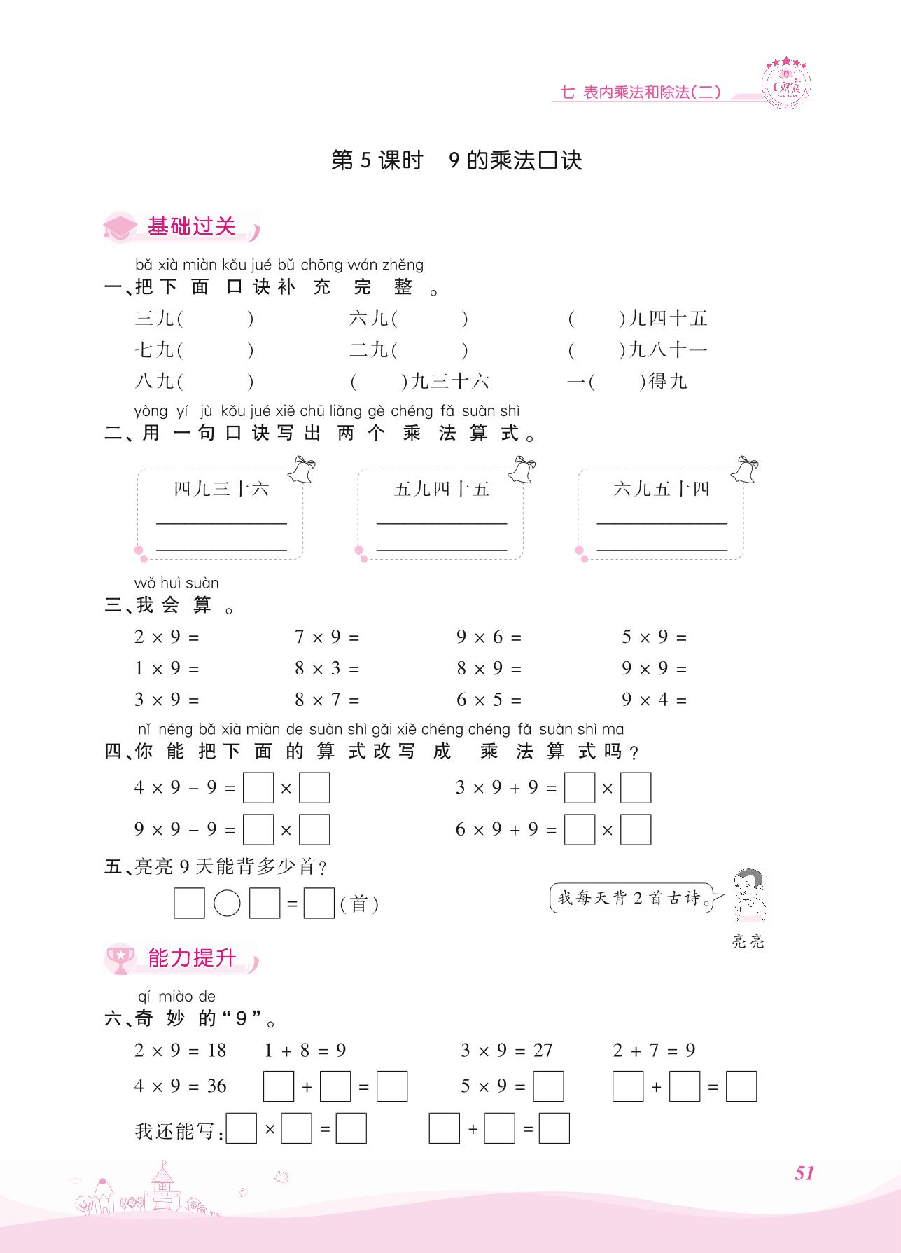 2021上册二年级数学冀教版 七 表内乘法和除法(二) 1. 7、8、9的乘法口诀——第5课时 9的乘法口诀