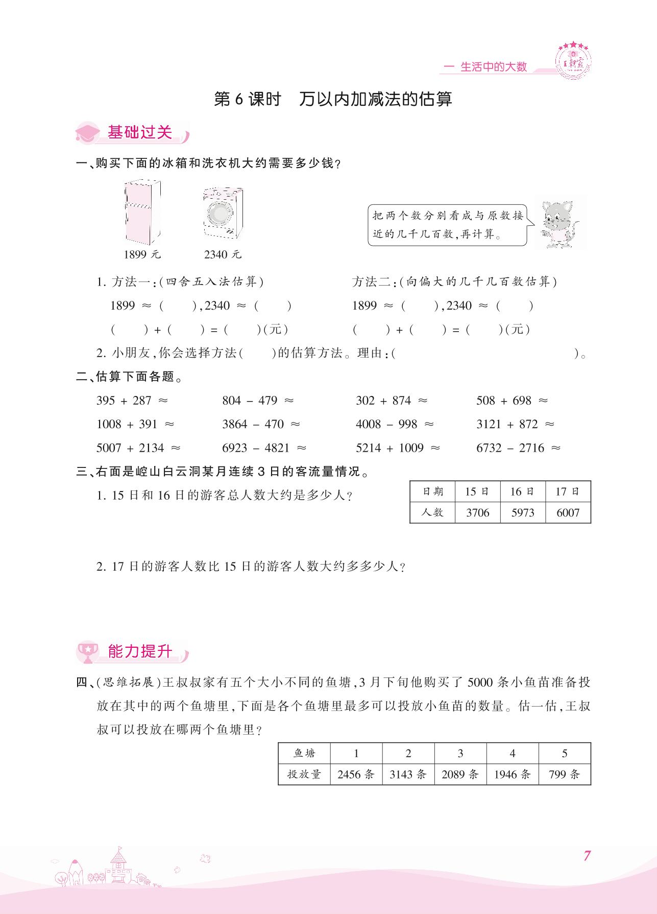 2021上册三年级数学冀教版 一 生活中的大数——第6课时 万以内加减法的估算