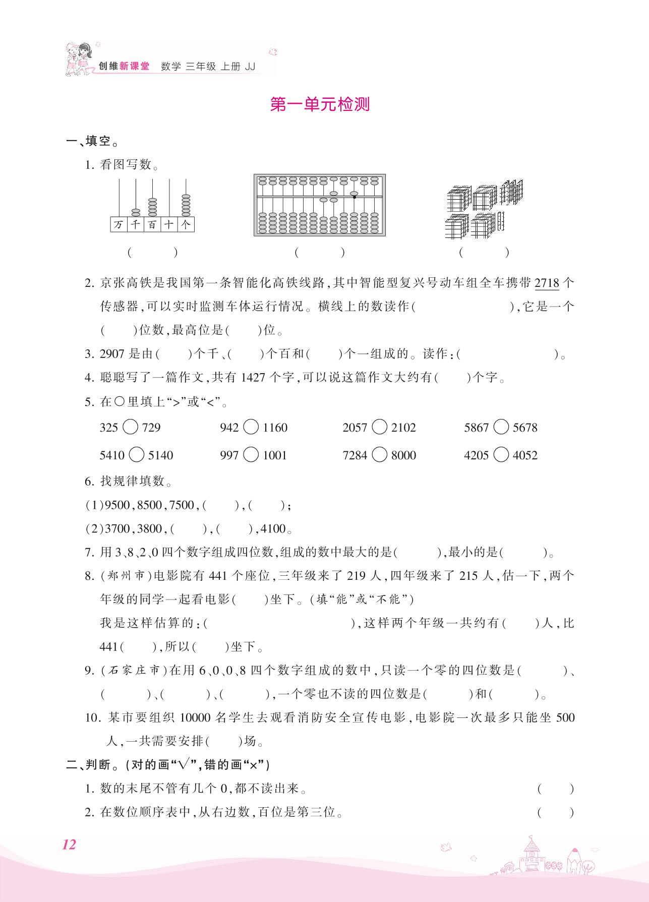 2021上册三年级数学冀教版 一 生活中的大数——第一单元检测