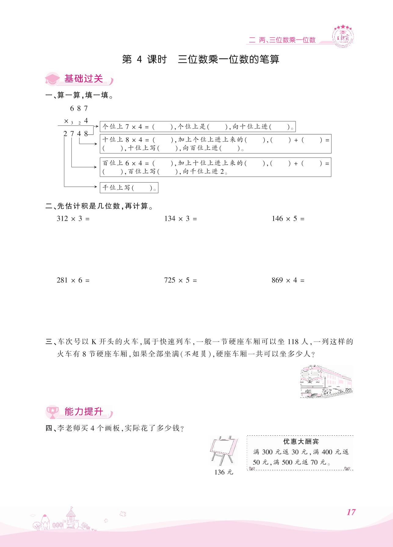 2021上册三年级数学冀教版 二 两、三位数乘一位数——第4课时 三位数乘一位数的笔算