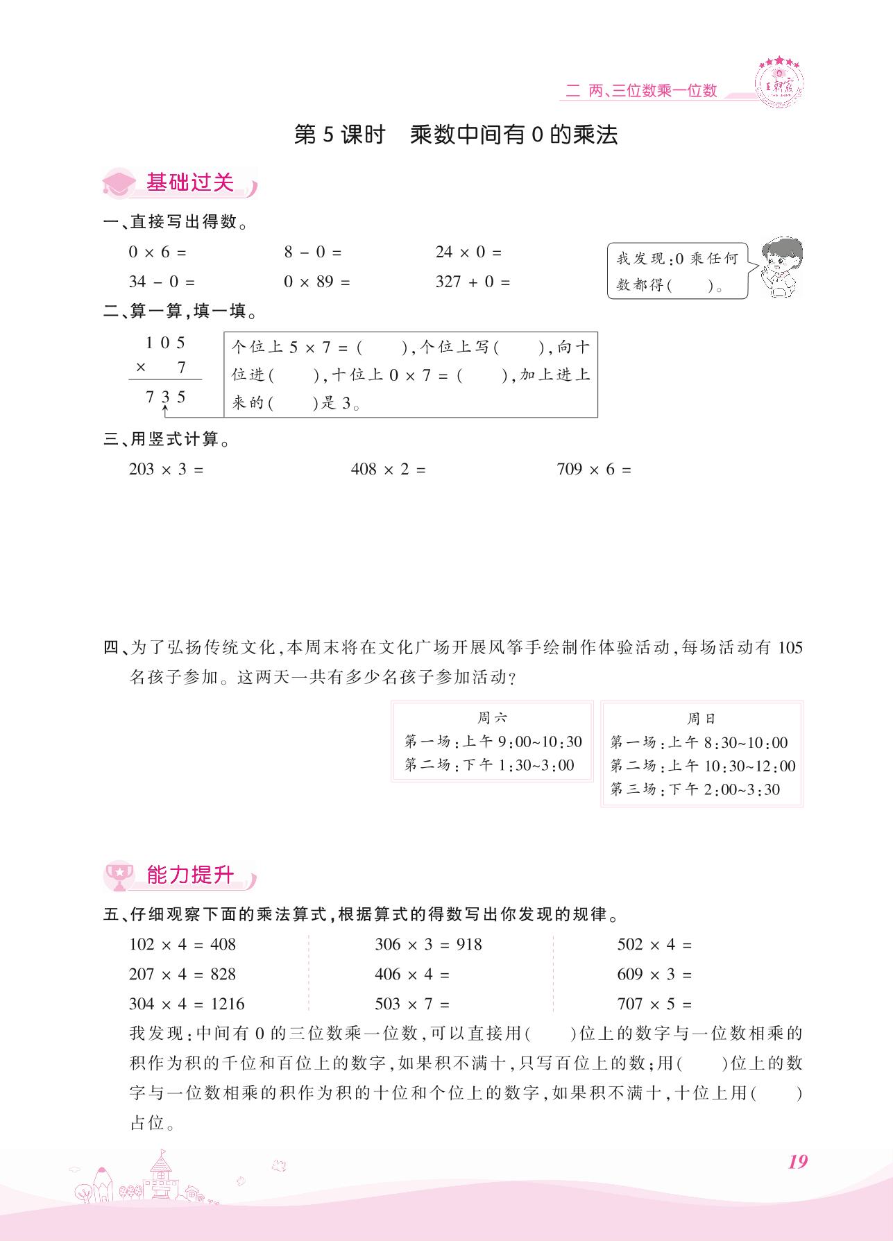 2021上册三年级数学冀教版 二 两、三位数乘一位数——第5课时 乘数中间有0的乘法