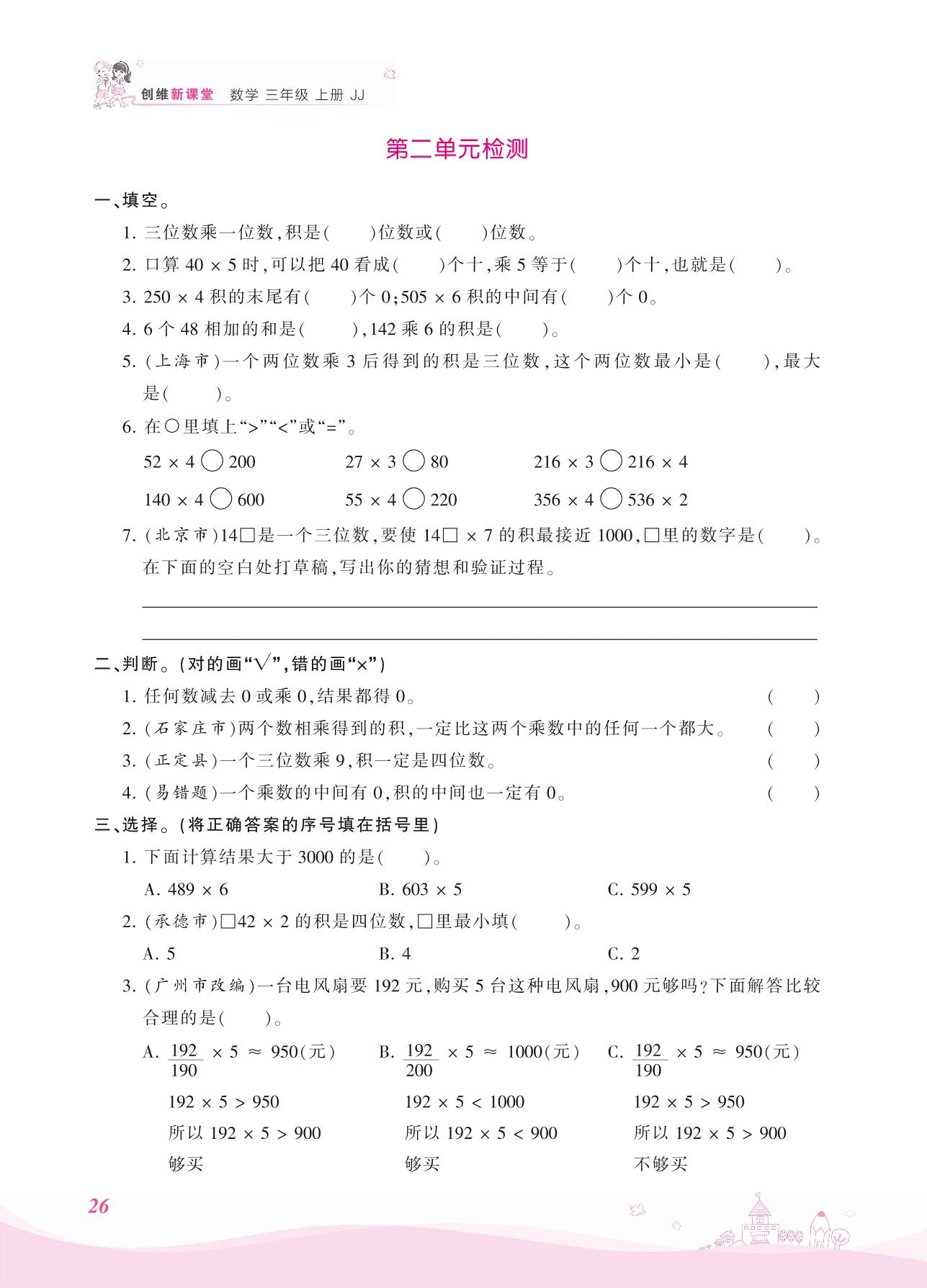2021上册三年级数学冀教版 二 两、三位数乘一位数——第二单元检测