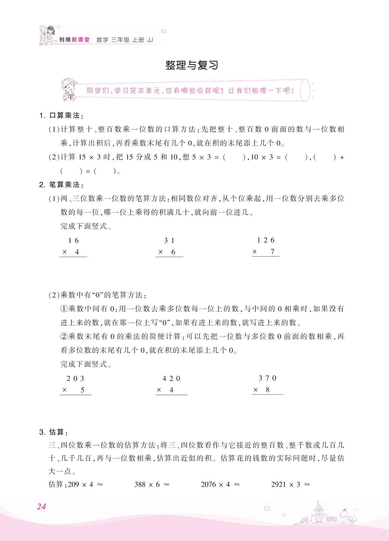 2021上册三年级数学冀教版 二 两、三位数乘一位数——整理与复习