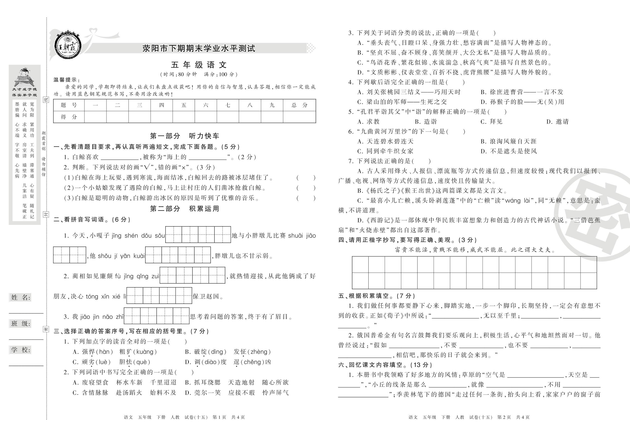 2015-2016学年第二学期荥阳市五年级语文试卷(人教版)【15】