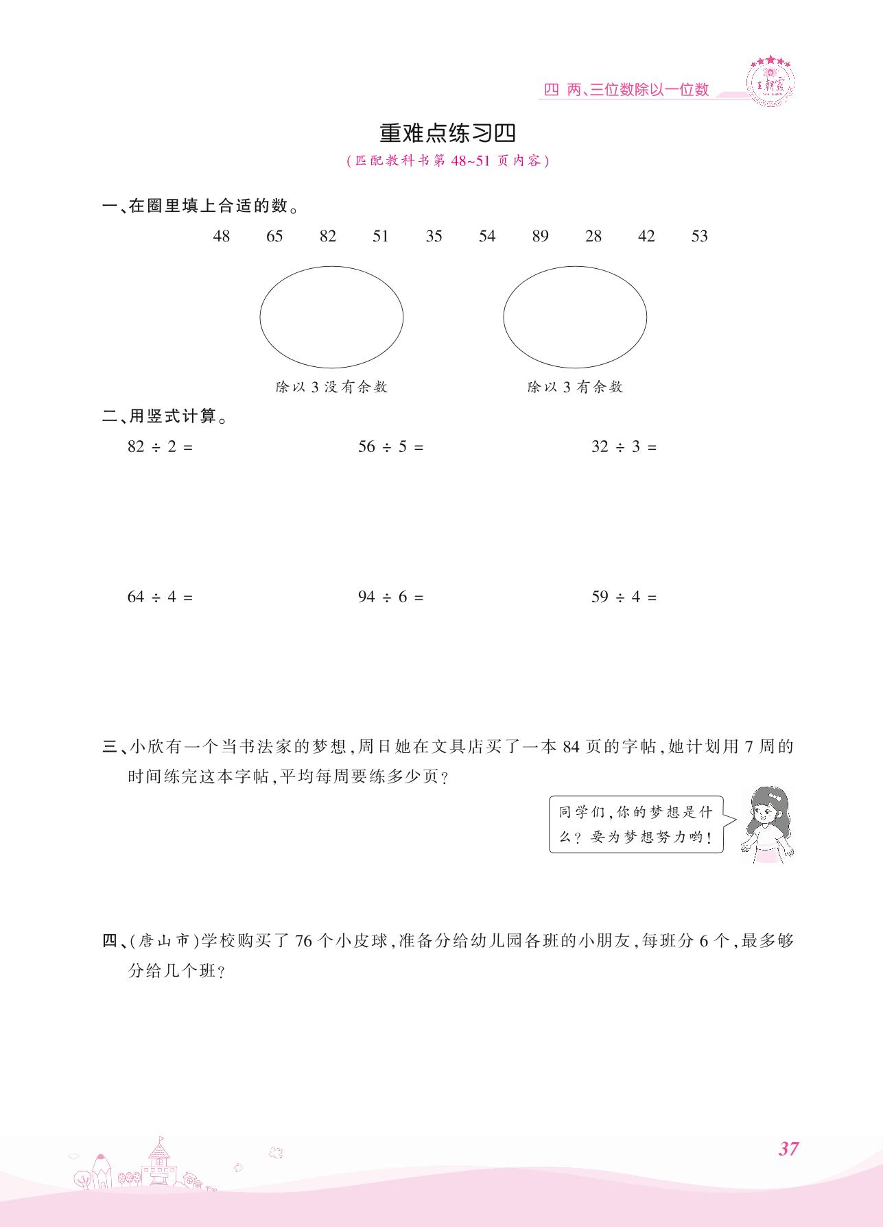 2021上册三年级数学冀教版 四 两、三位数除以一位数——重难点练习四