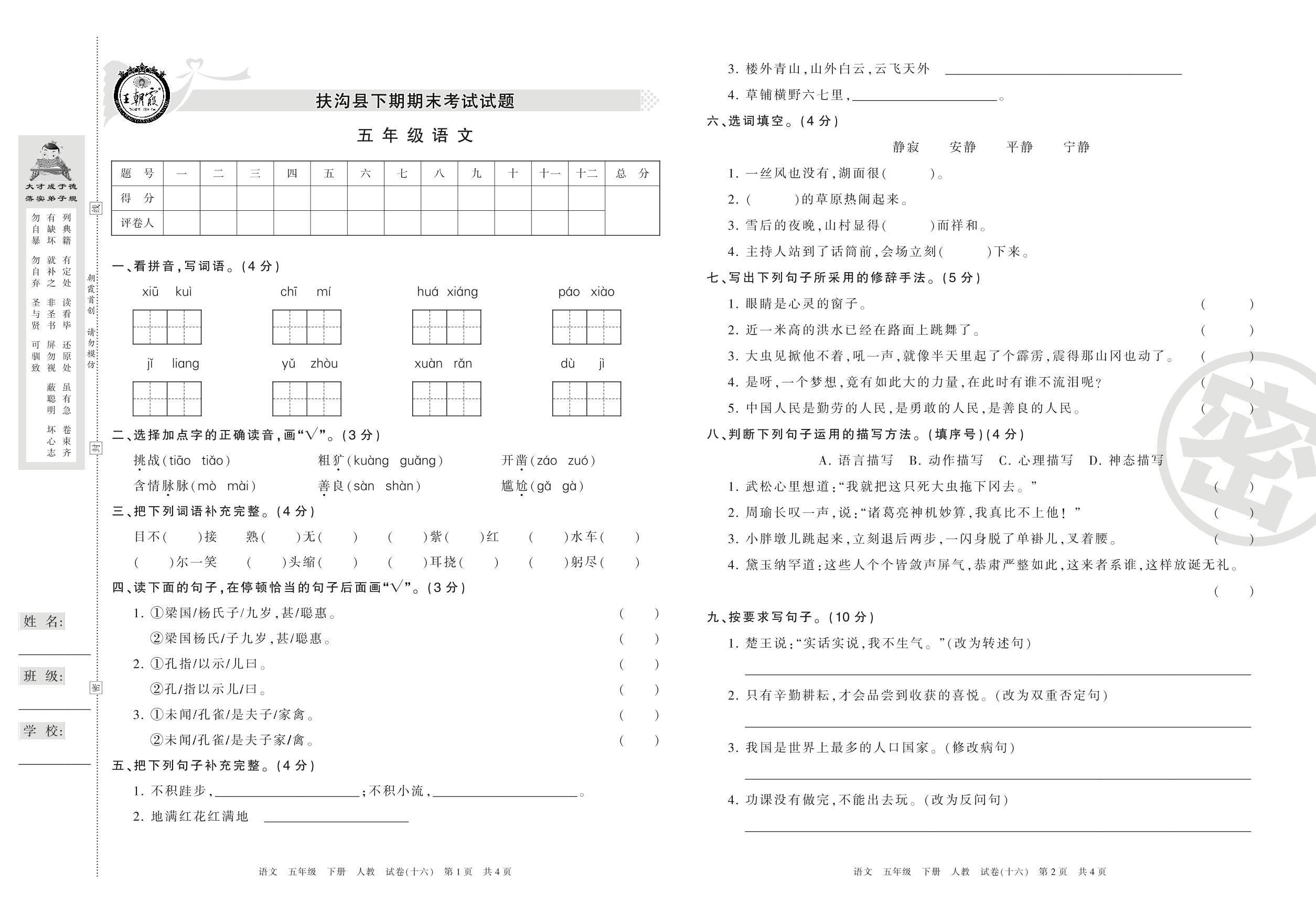 2015-2016学年第二学期周口市扶沟县五年级语文试卷(人教版)【16】