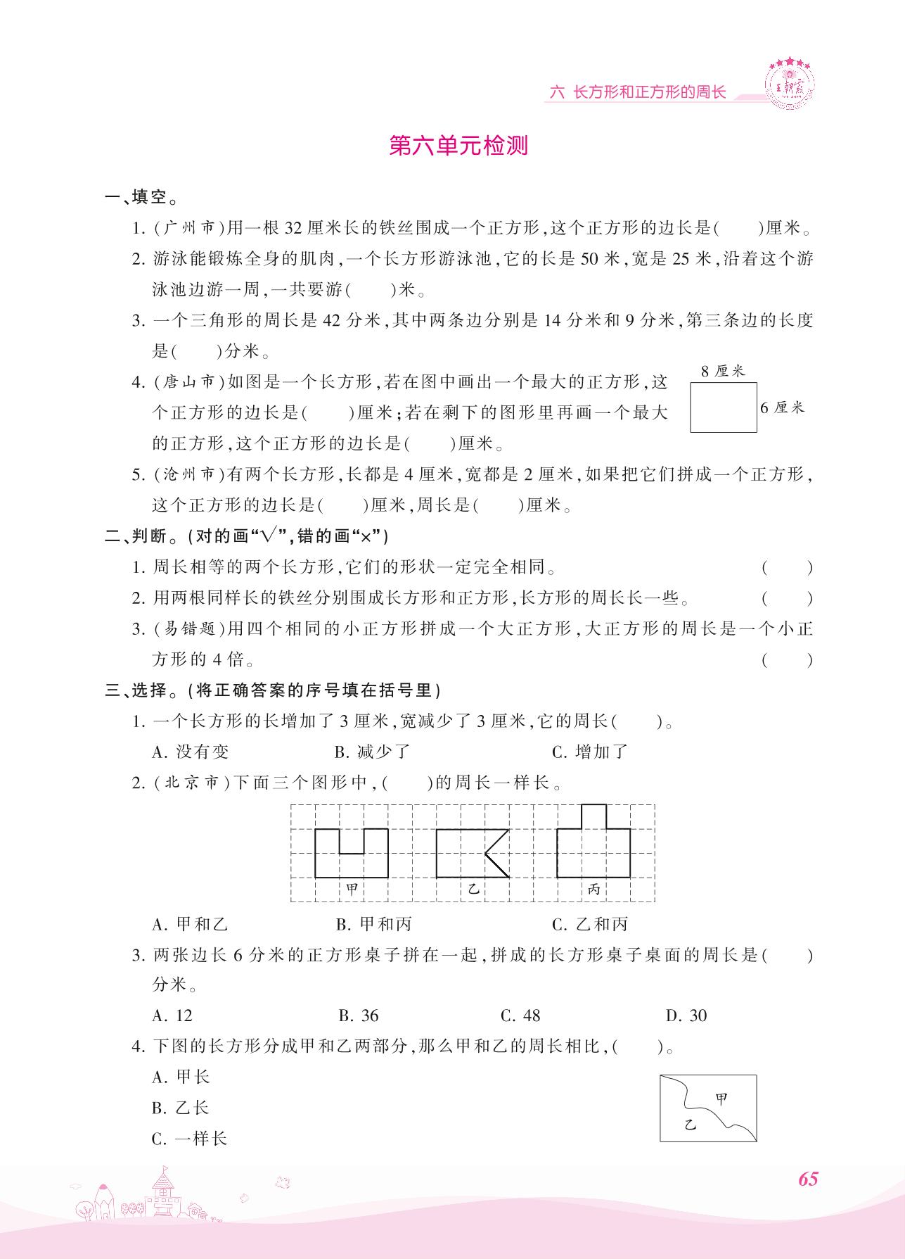 2021上册三年级数学冀教版 六 长方形和正方形的周长——第六单元检测