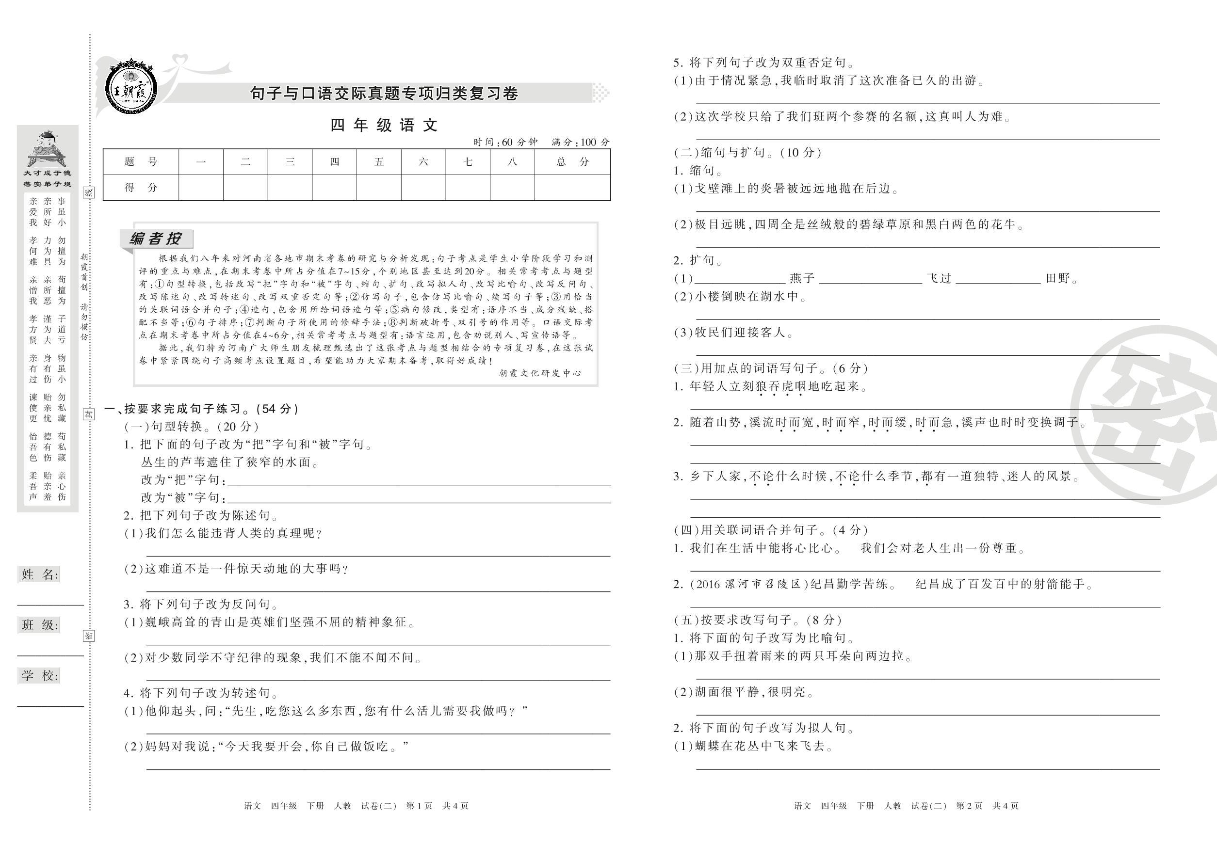 王朝霞期末专项卷四年级下册语文(人教版)_R210801210052【2】