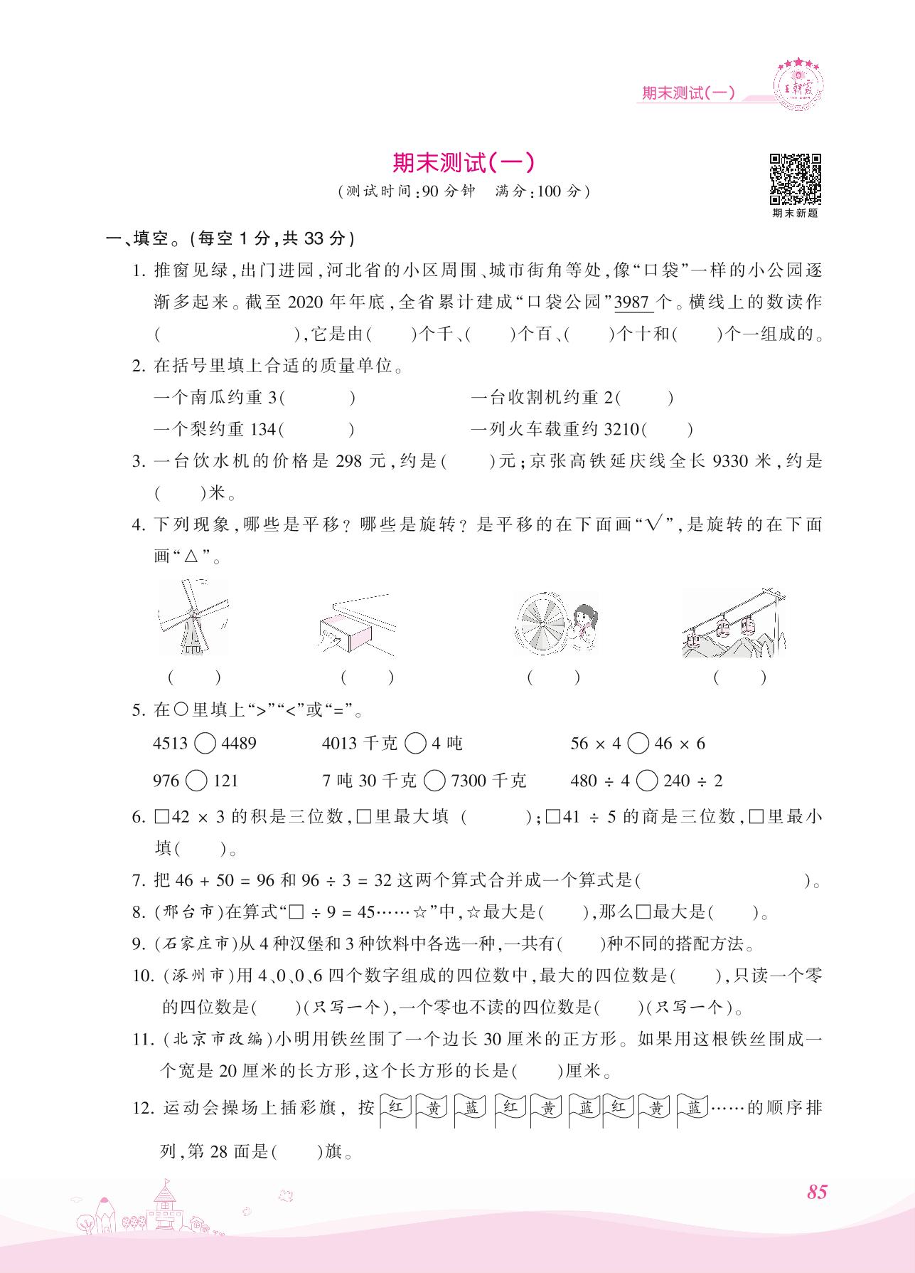 2021上册三年级数学冀教版 期末测试(一)