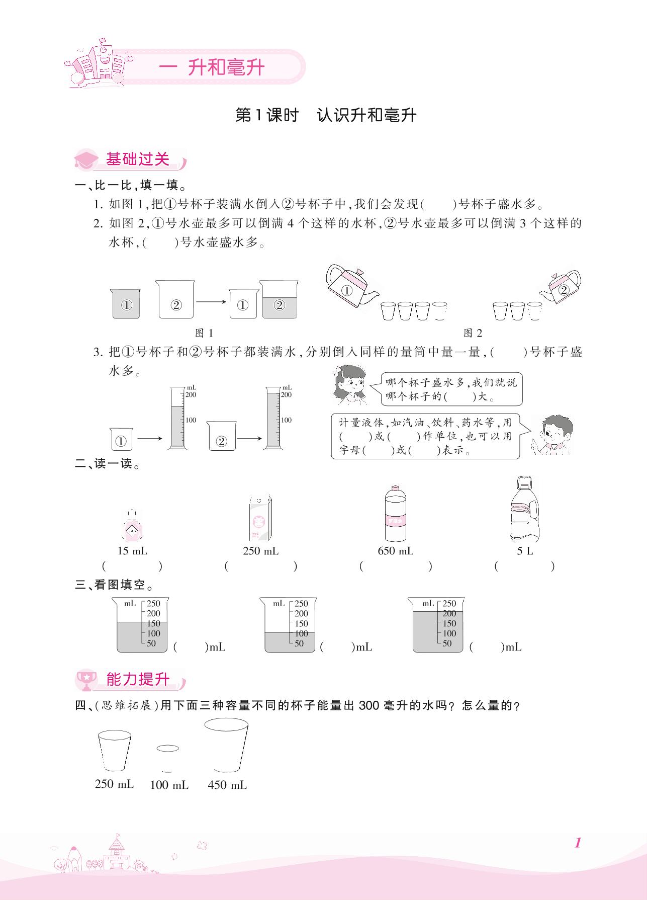 2021上册四年级数学冀教版 一 升和毫升——第1课时 认识升和毫升